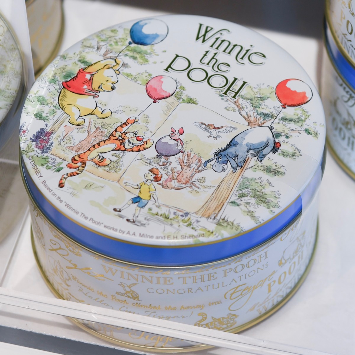 プーさんのハニーハントデザインアートがかわいい円形のクッキー缶。