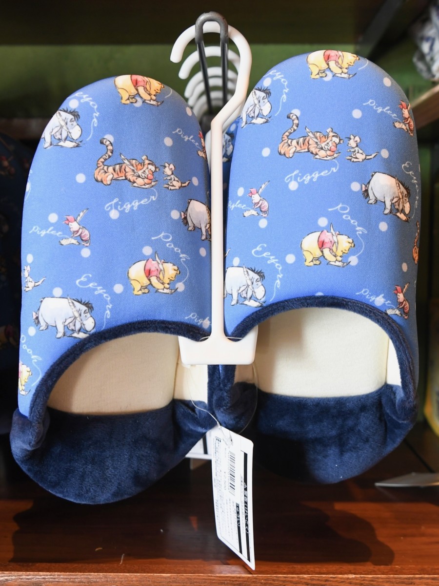 ブルーの鮮やかなルームシューズには自分の名前を書くプーさんたちが総柄でデザインされています。