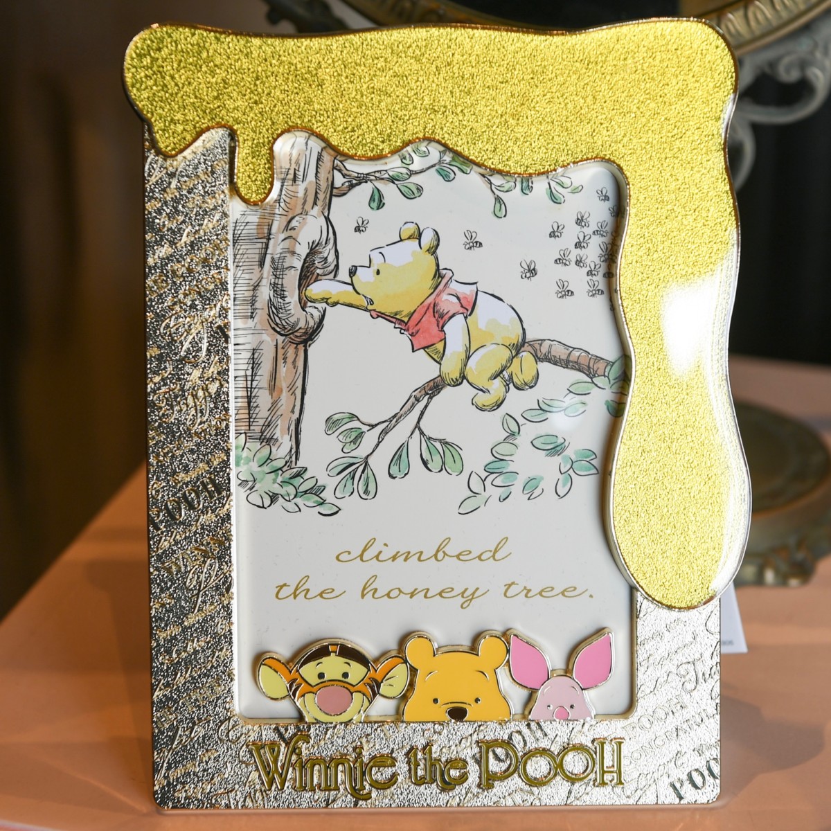 フレームからひょっこり顔をだすプーさん、ティガー、ピグレットととろっとしたはちみつがデザインされたフォトスタンド。