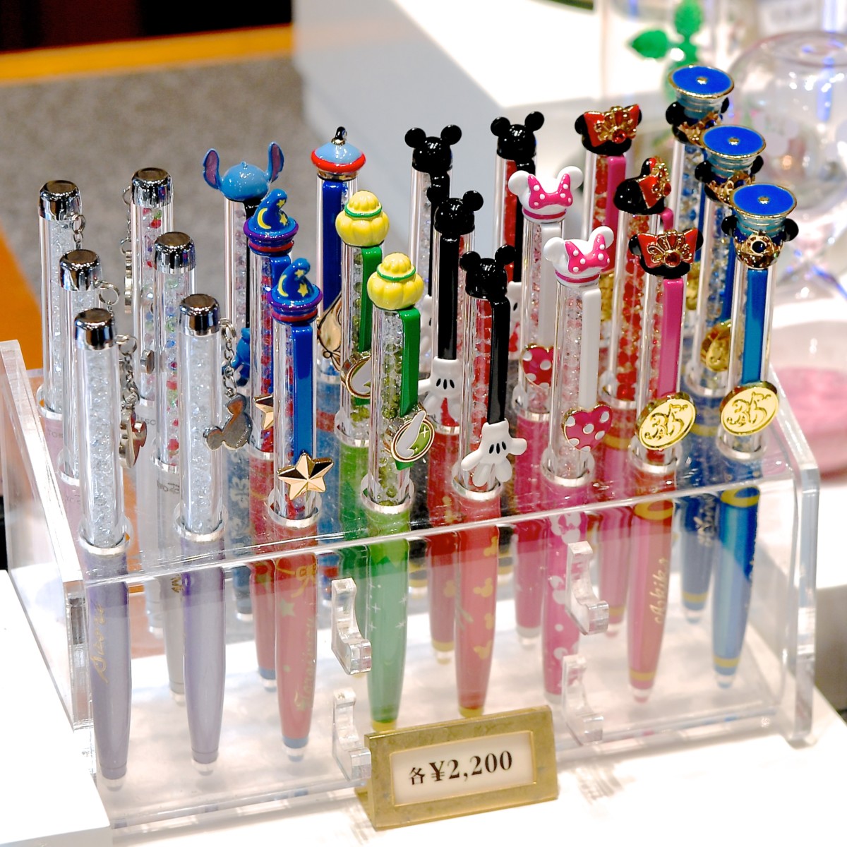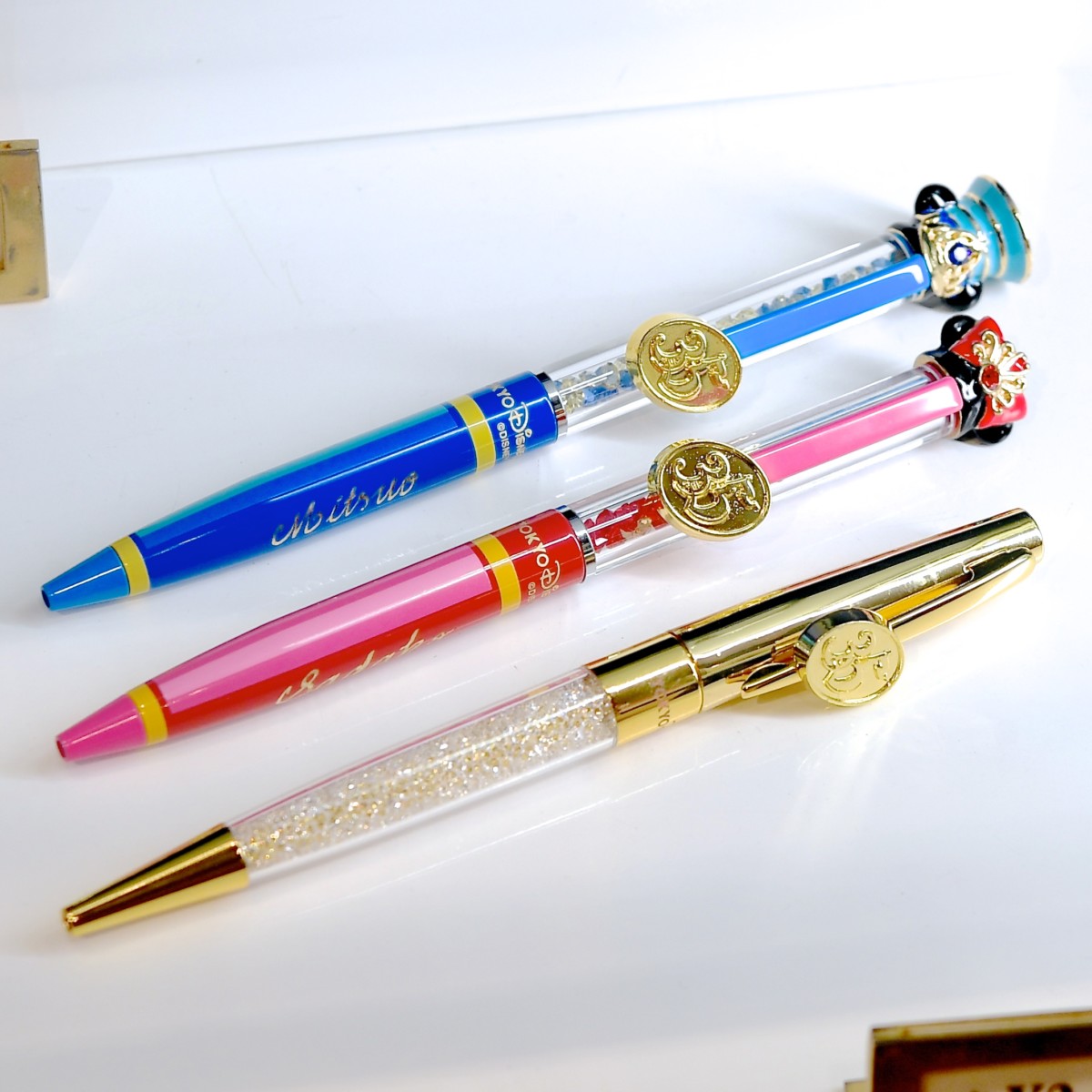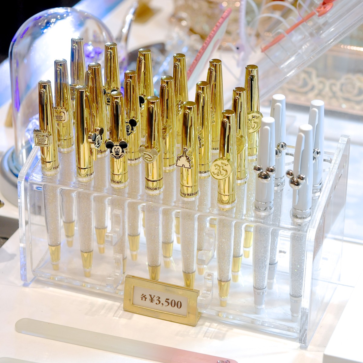 他にも、ゴールドのミッキデザインやシンデレラ城モチーフなどチャーム付き高級ボールペンも販売中。