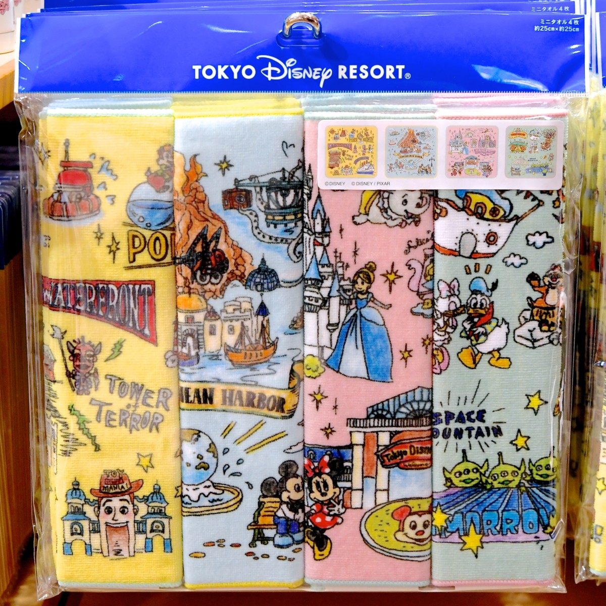ポートディスカバリーやアメリカンウォーターフロント、メディテレーニアンハーバー、ファンタジーランドとワールドバザール、トゥーンタウンとトゥモローランドがデザインされたミニタオルセット。