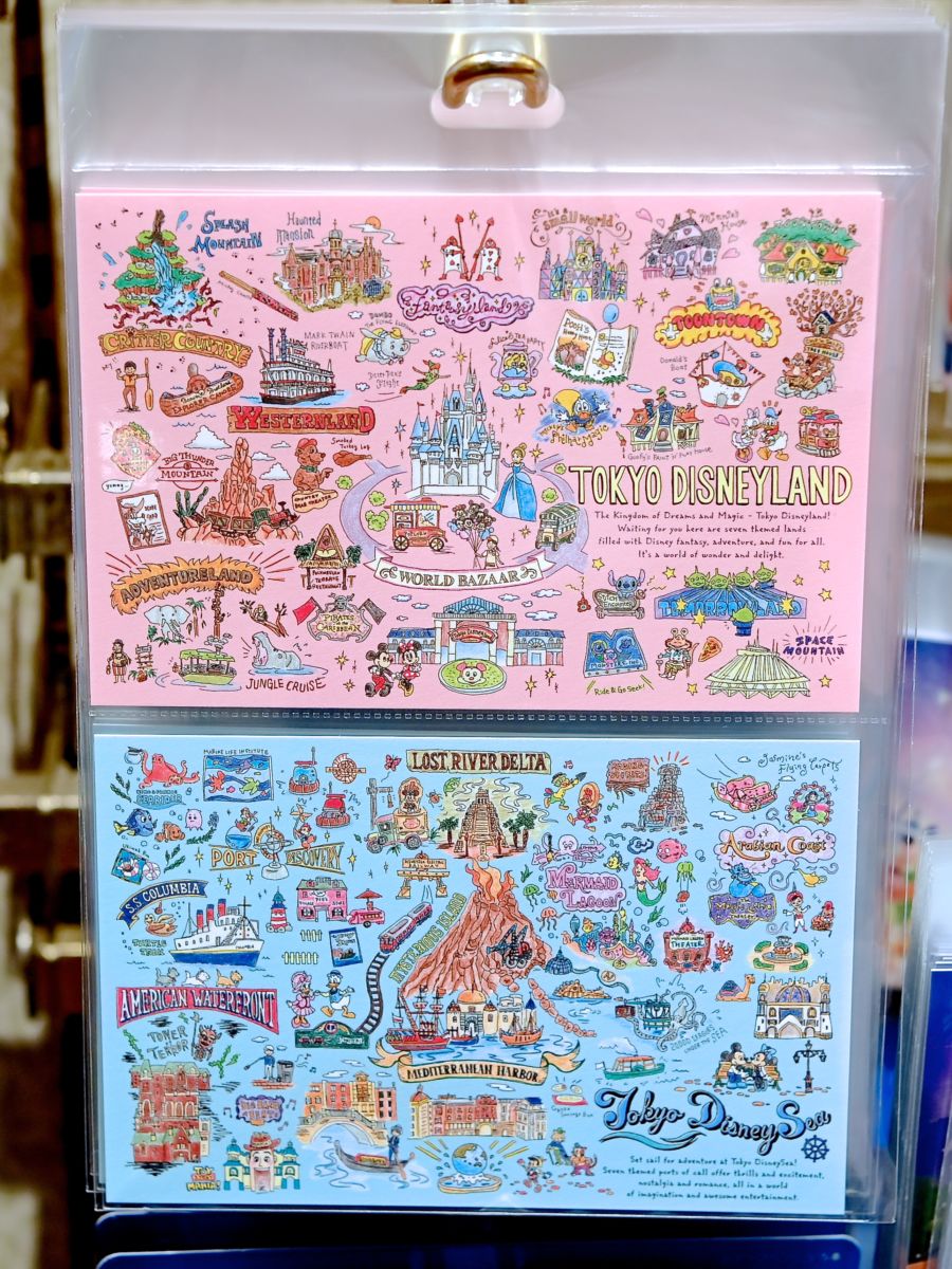 東京ディズニーランドのマップ柄、東京ディズニーシーのマップ柄の2枚のポストカード。