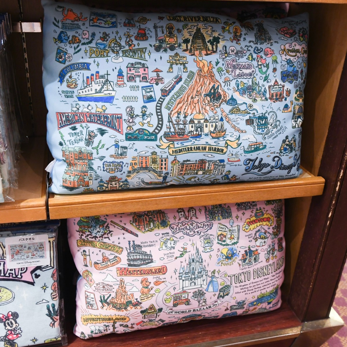 東京ディズニーランド(ピンク)と東京ディズニーシー(ブルー)の地図が手書き風アートで描かれたクッション。