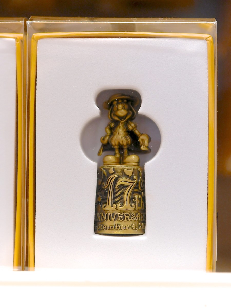ゴンドラにのるミッキーとミニー、17周年の文字がデザインされたスーベニアメダル。