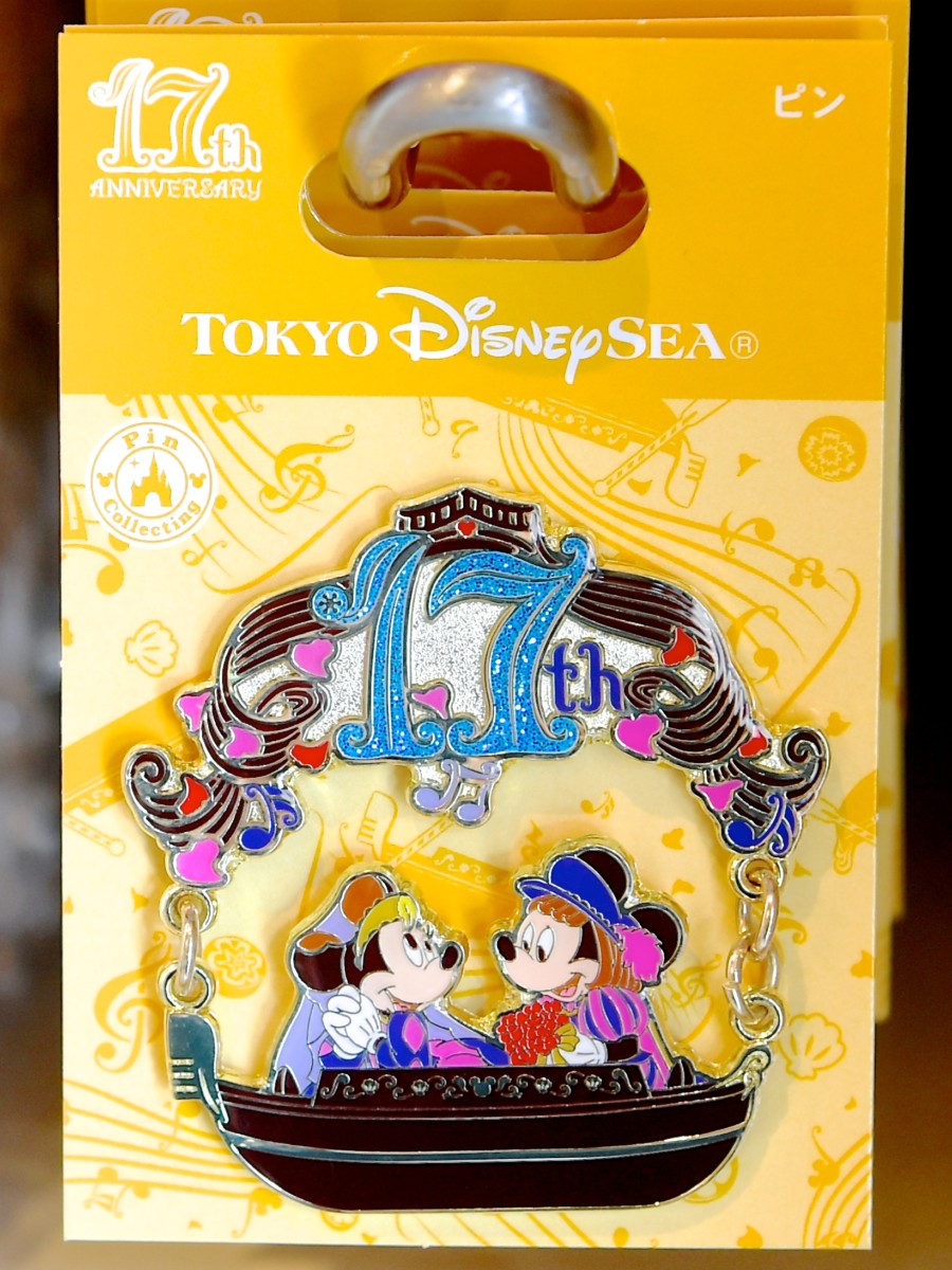 ゴンドラに乗ったミッキーとミニー、17周年のロゴがデザインされたおしゃれなピン。