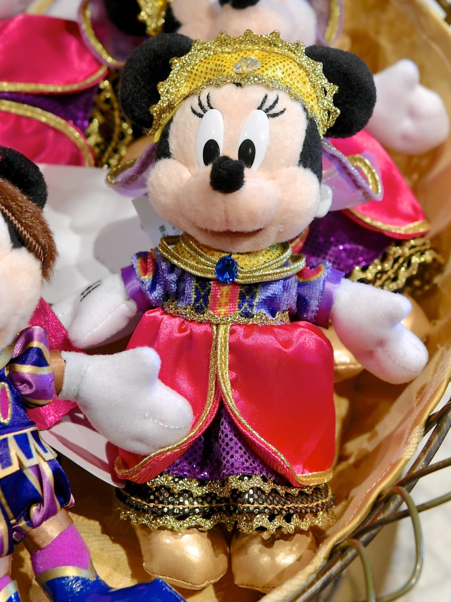華やかな髪飾りがついた豪華なドレス姿のジュリエットコスチュームのミニーちゃんぬいぐるみバッジ。