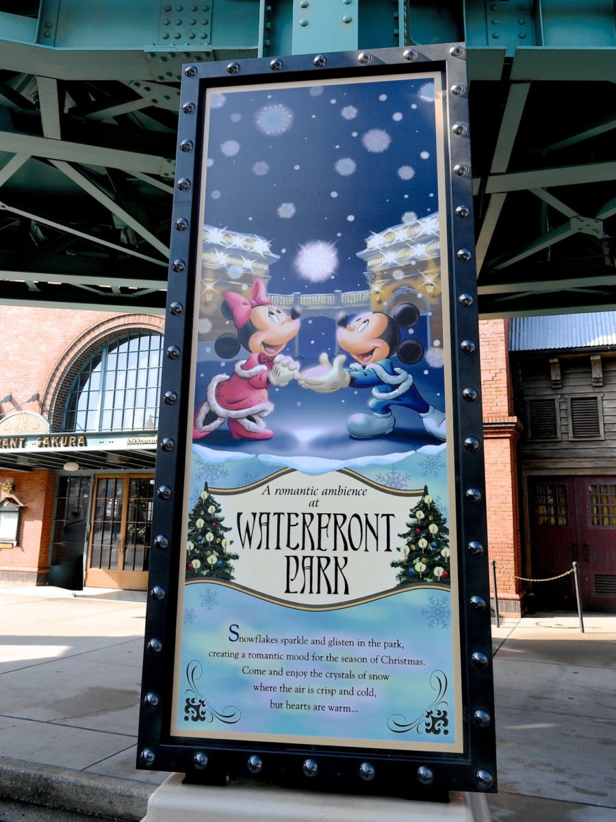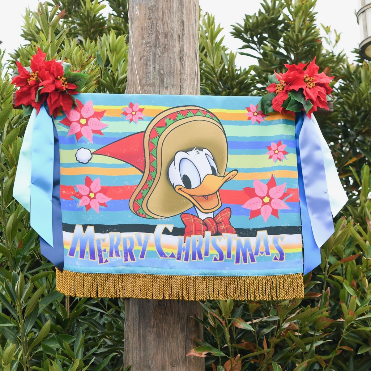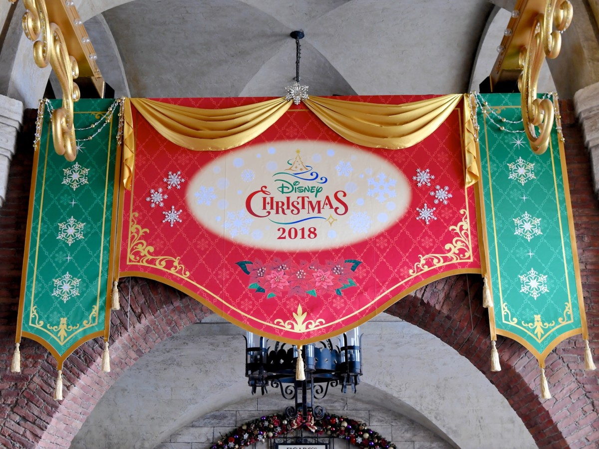 カフェ・ポルトフィーノ前には“ディズニー・クリスマス2018”のロゴと