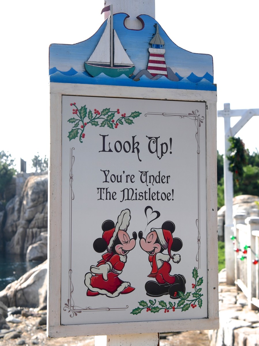 ヤドリギの下でキスをしているミッキーたちの看板。