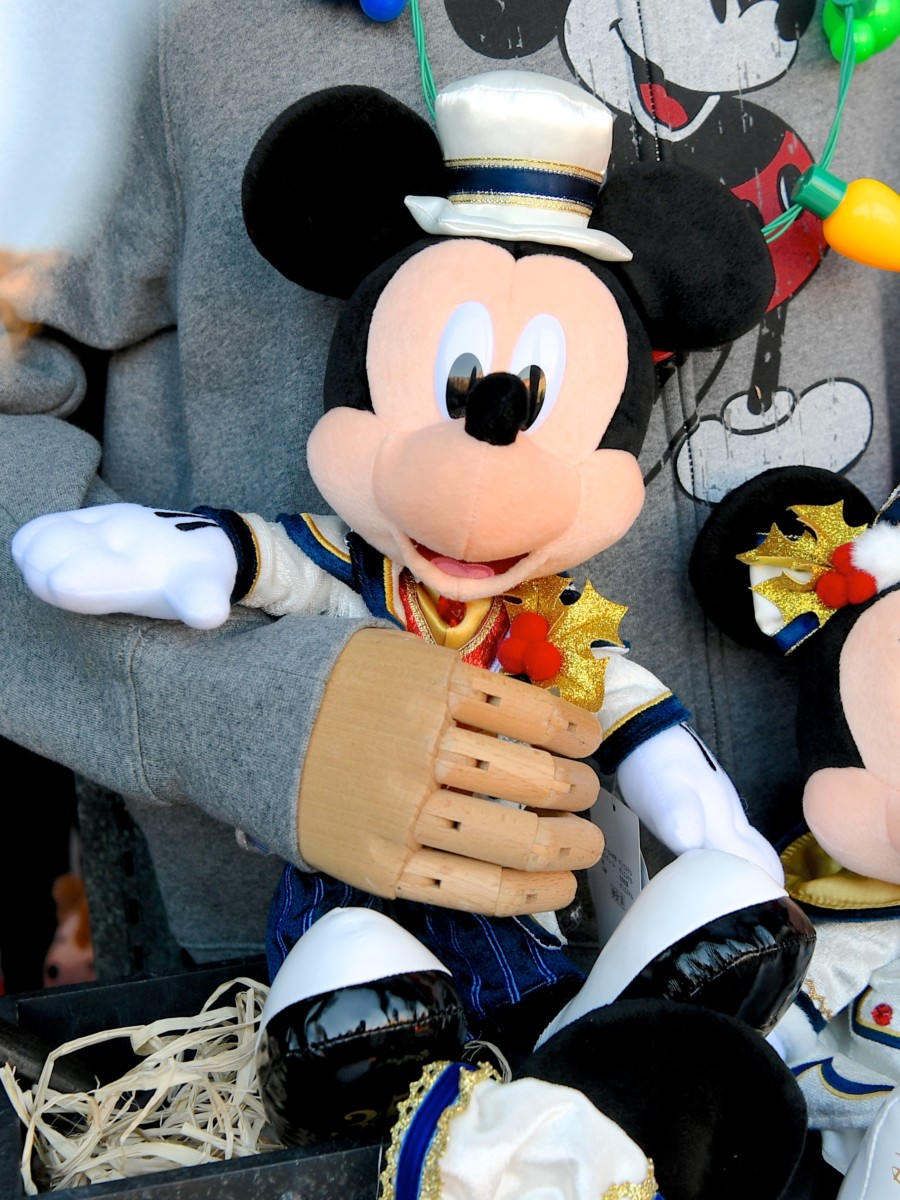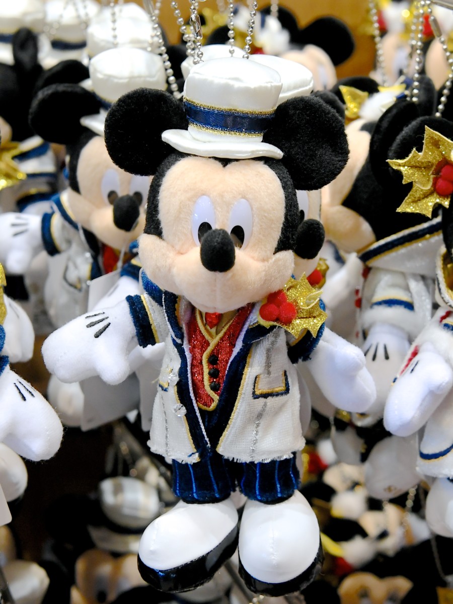 新ハーバーショー「イッツ・クリスマスタイム!」に登場するコスチュームを着たミッキーのぬいぐるみ。