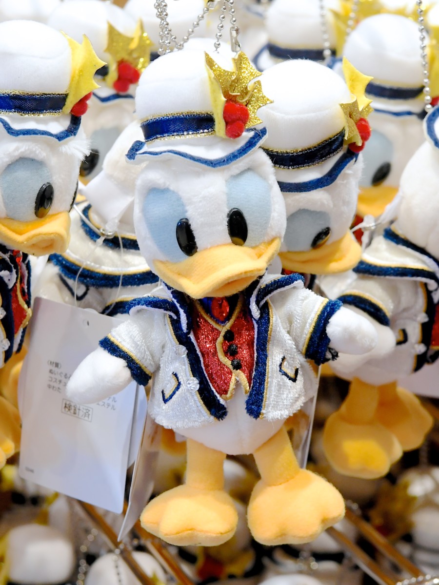 ホワイトにブルーとゴールドのラインが入ったコートとハット、赤いベストにストライプのズボンを着たミッキーのぬいぐるみ。