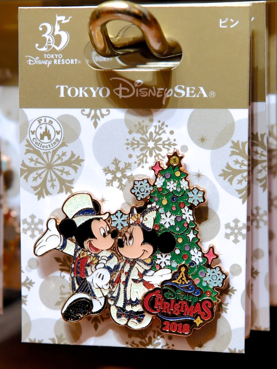 華やかなクリスマスツリーをバックにしたミッキーとミニーデザインのピン。