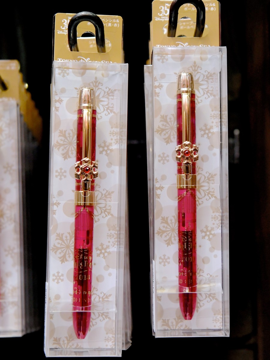 “ディズニー・クリスマス2018”のロゴや雪の結晶などがデザインされたレッド×ゴールドの高級感のあるペン。