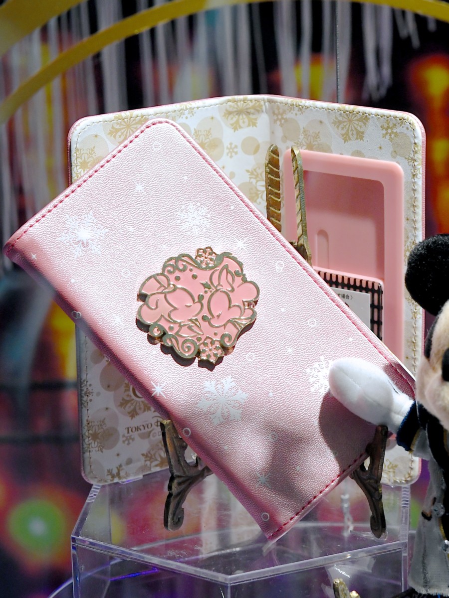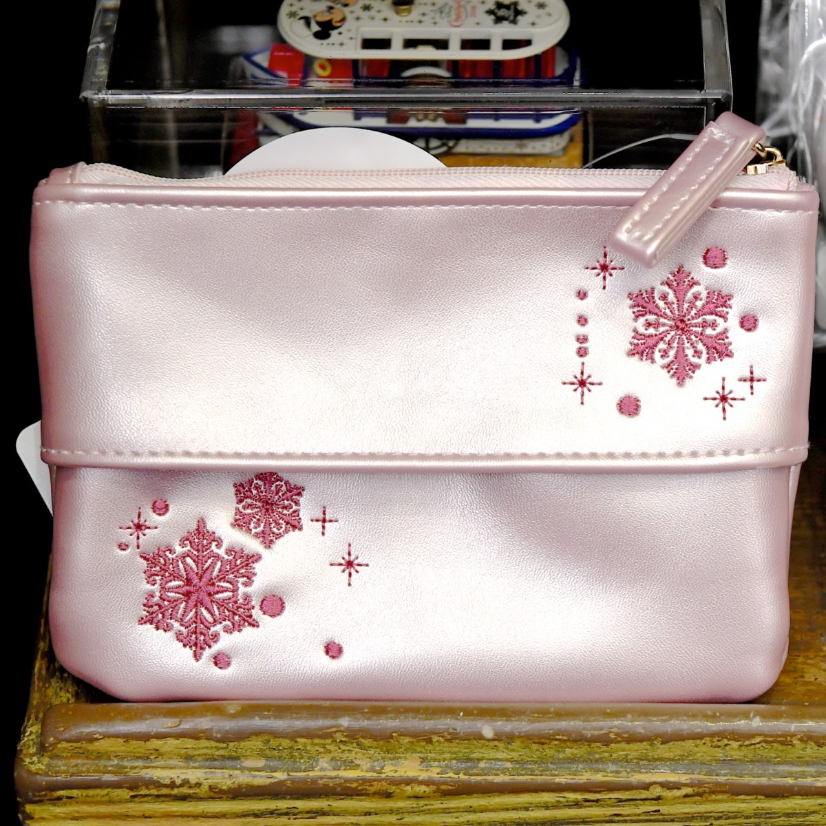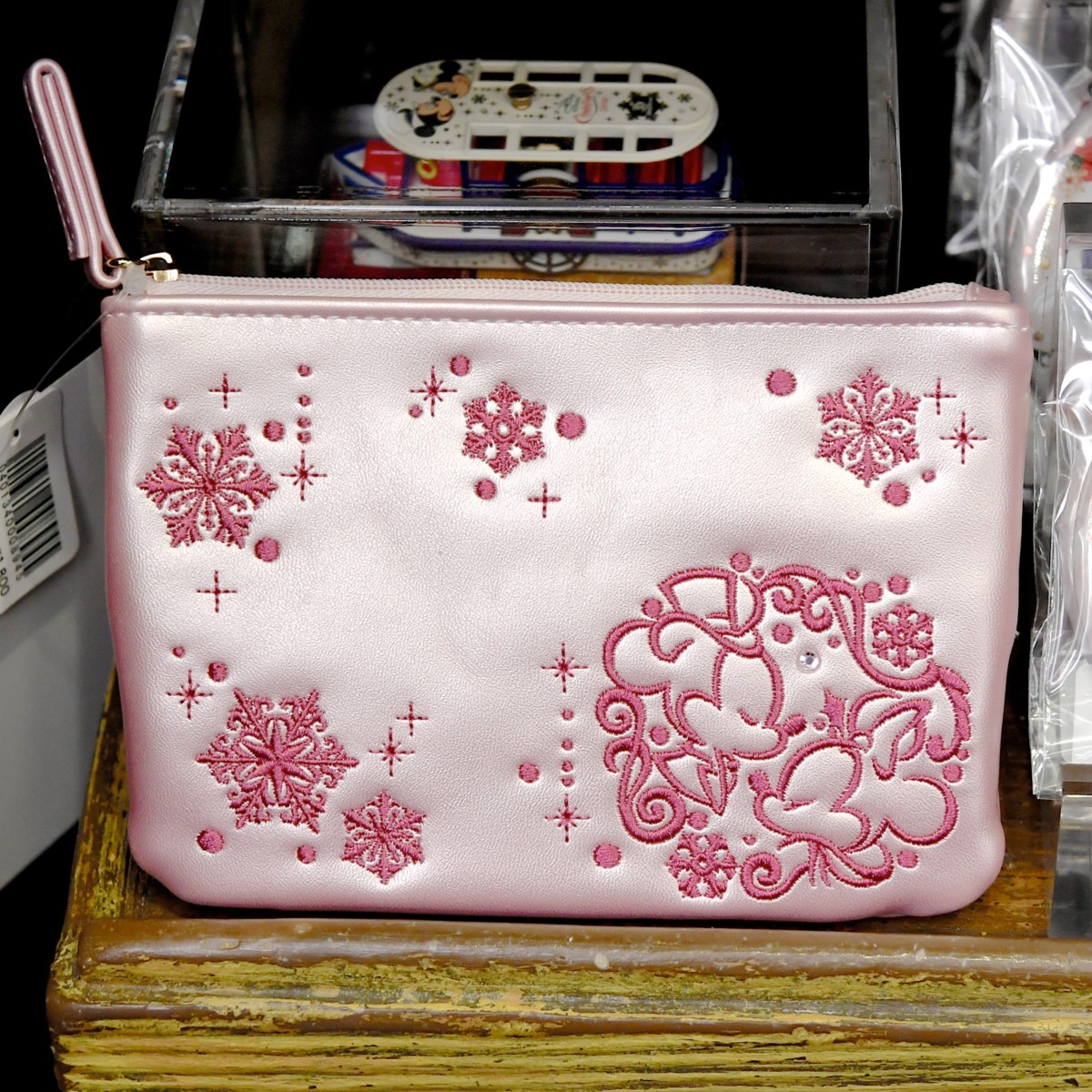 雪の結晶とミッキー&ミニーがデザインされたおしゃれなポーチ。