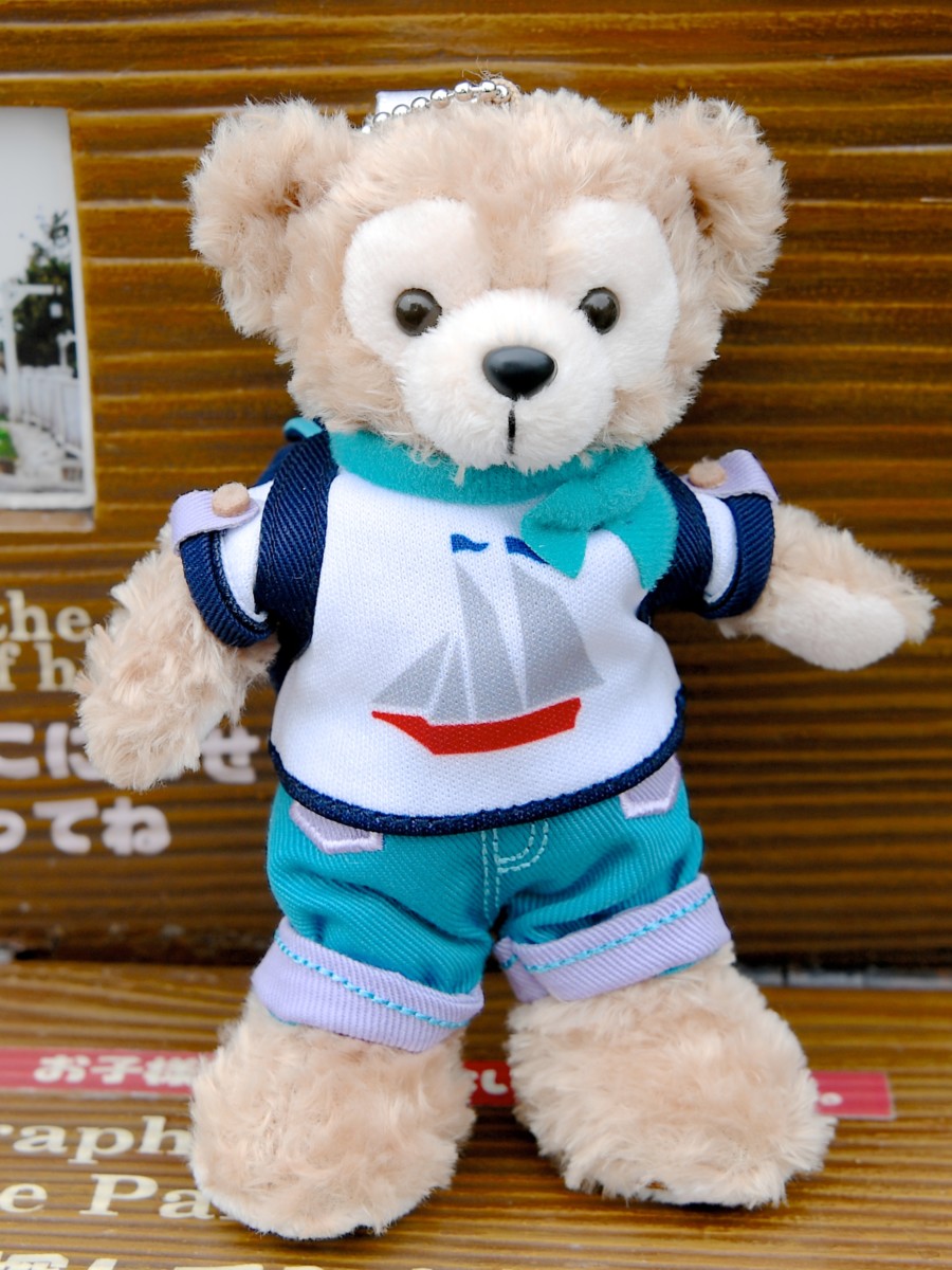 お船がデザインされたTシャツにエメラルドグリーンのマフラー、ズボンを着た爽やかなダッフィー。