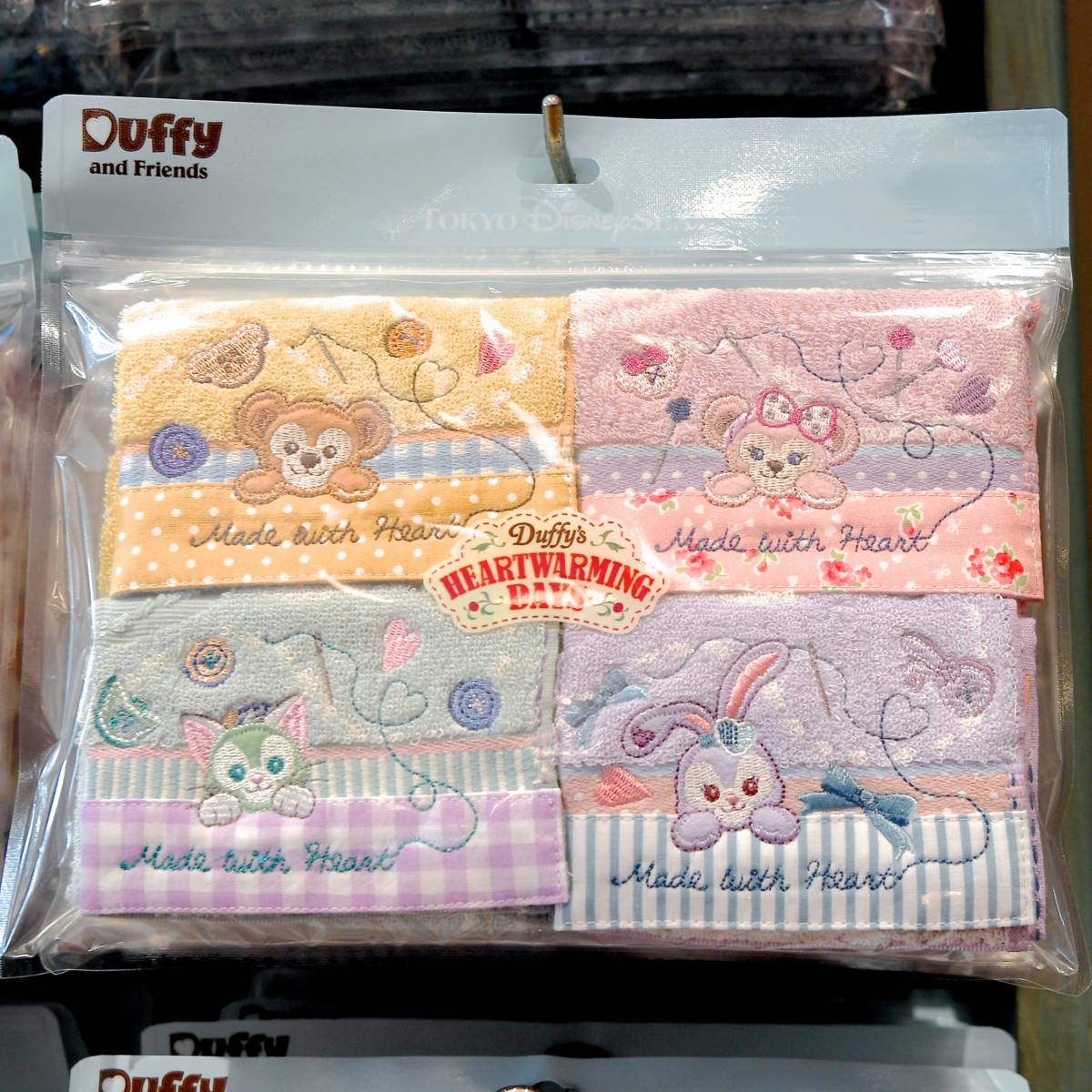 裁縫道具とダッフィー、シェリーメイ、ジェラトーニ、ステラ・ルーの刺繍が入ったミニタオル4枚セット。