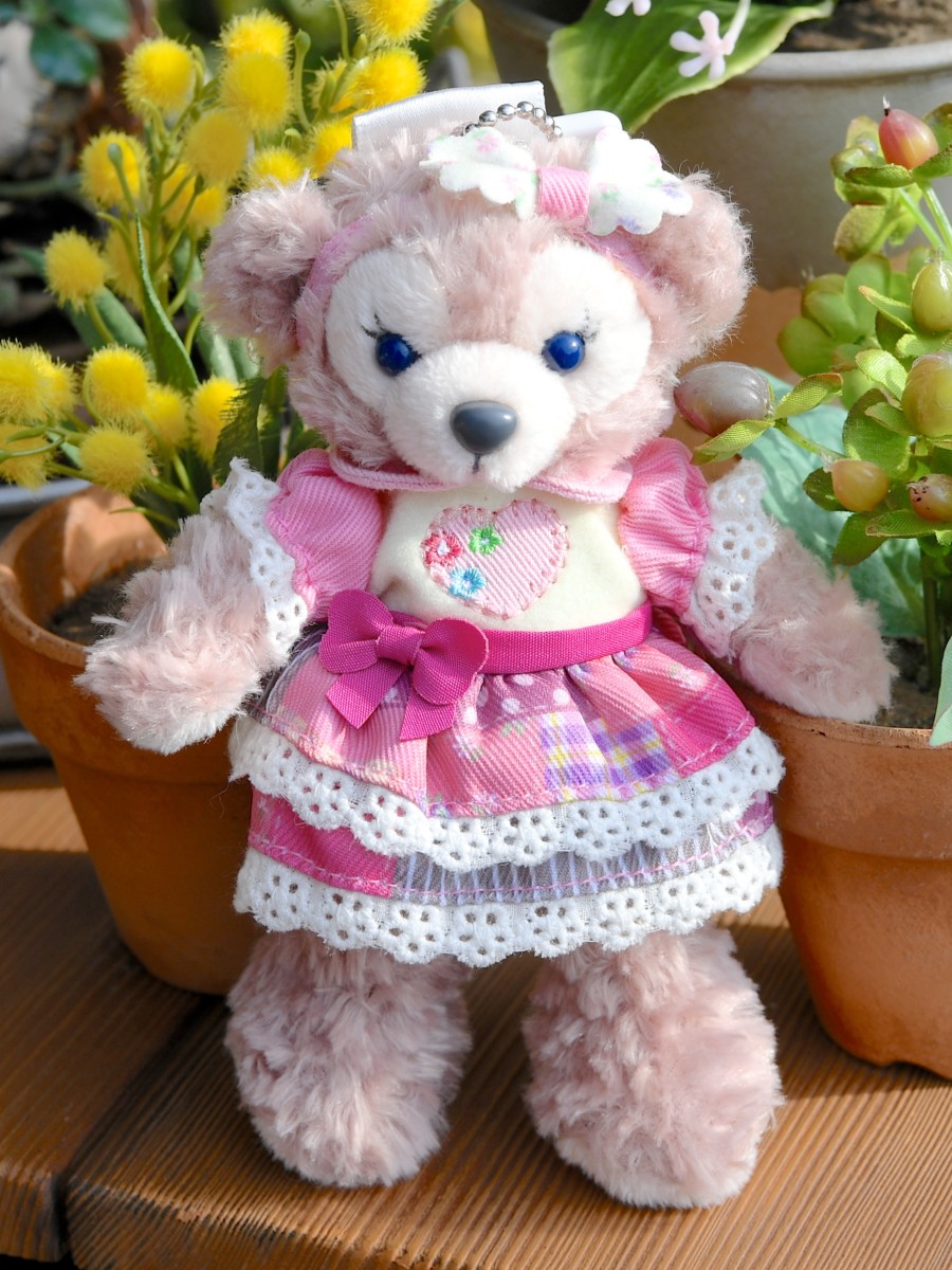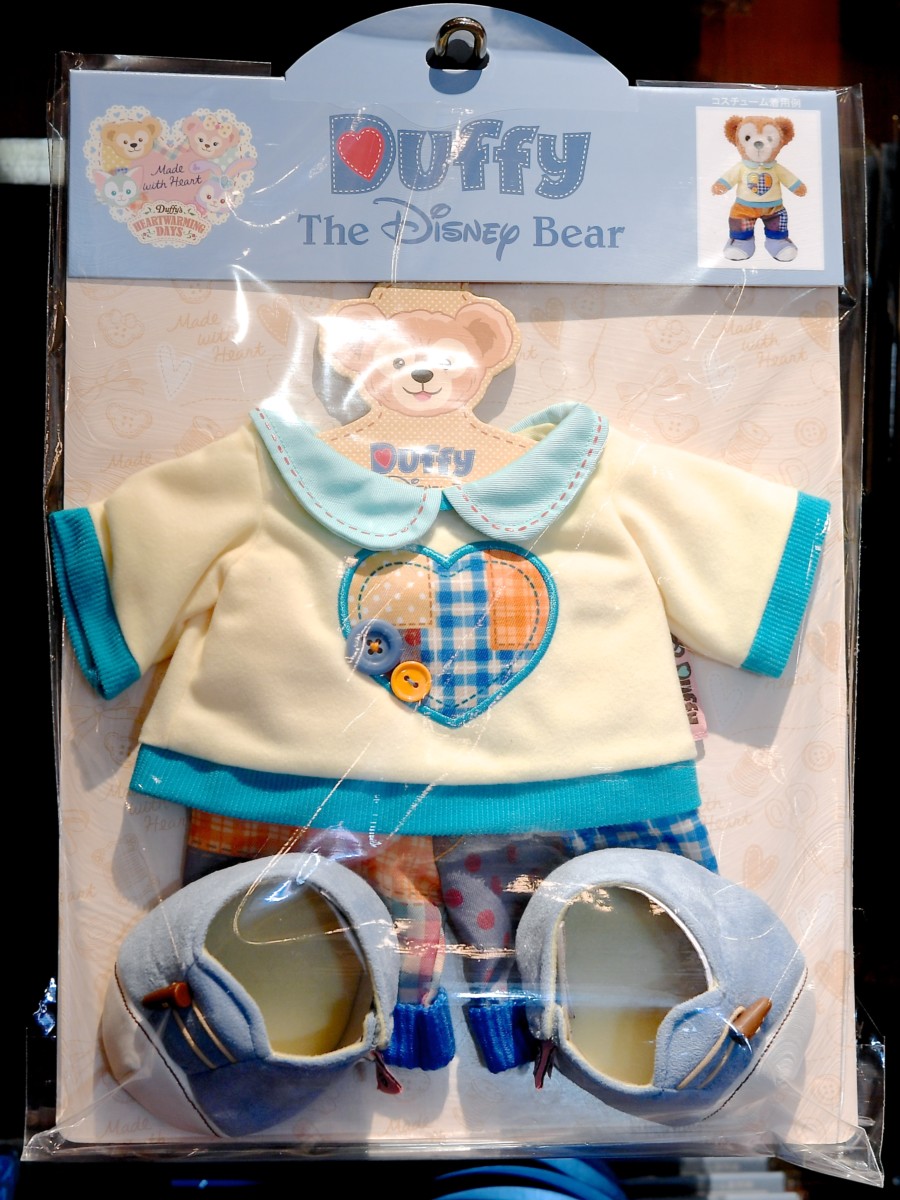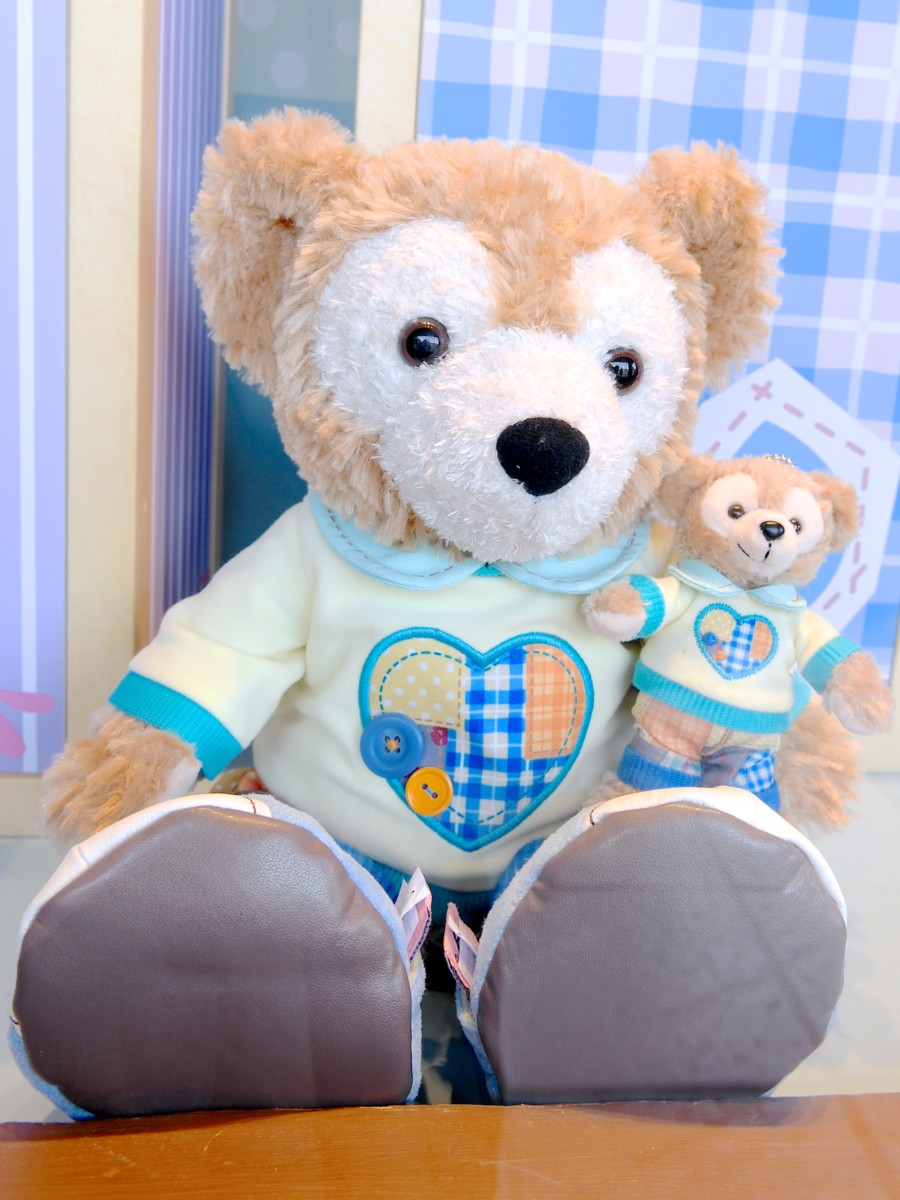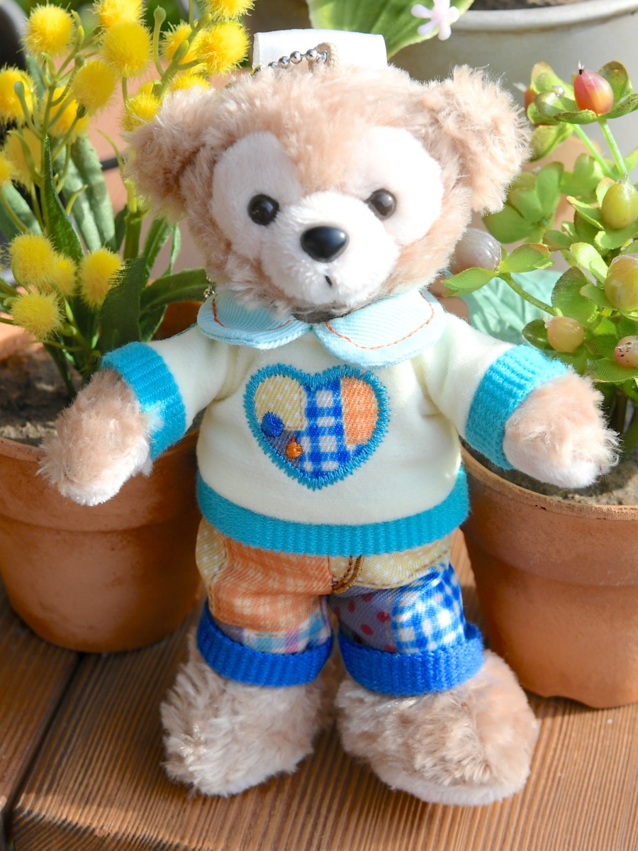 大きなハートのパッチワークのついた服を着ているダッフィー。