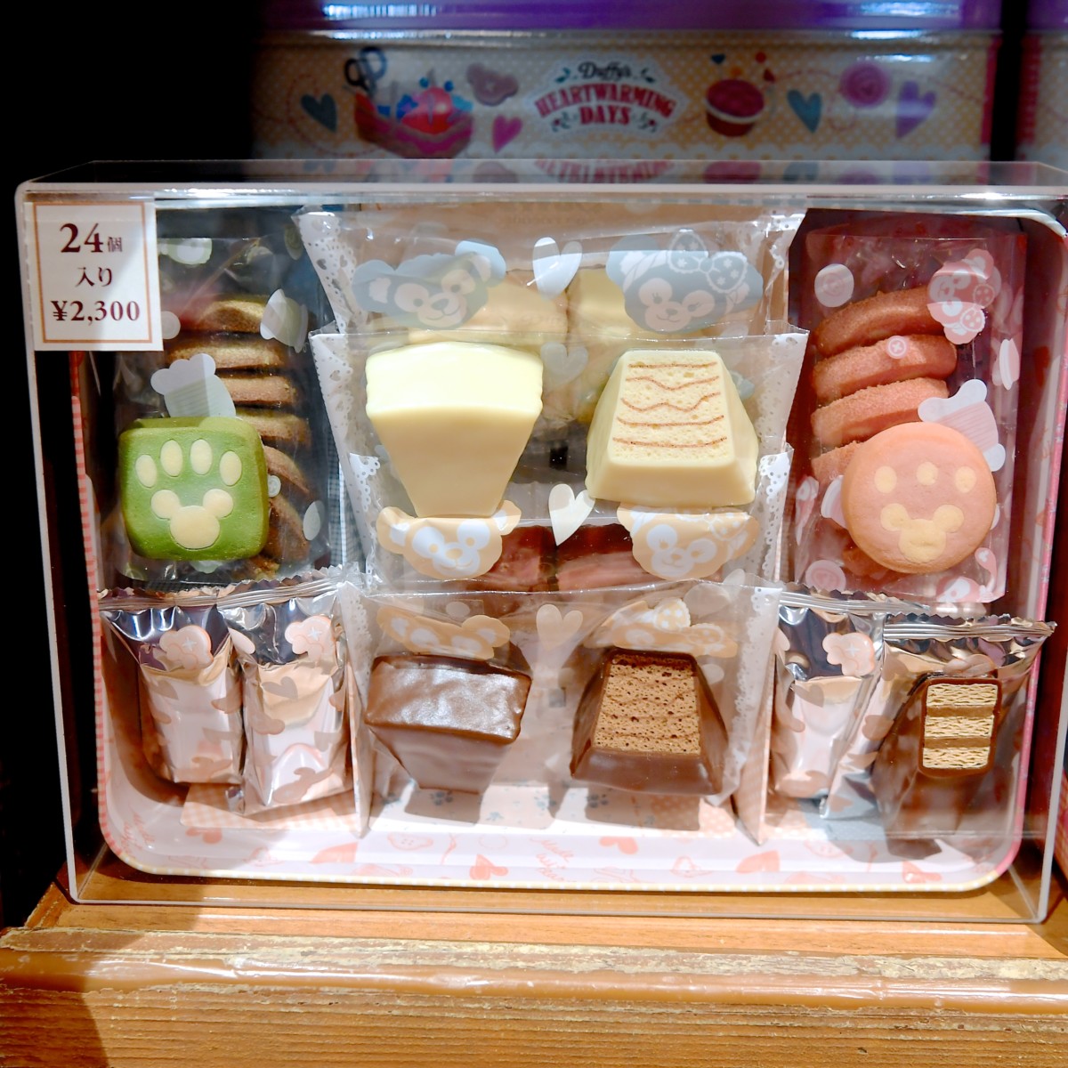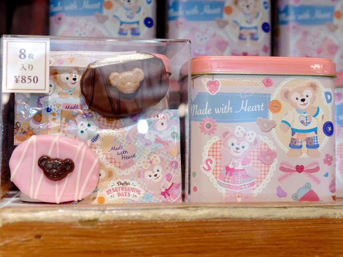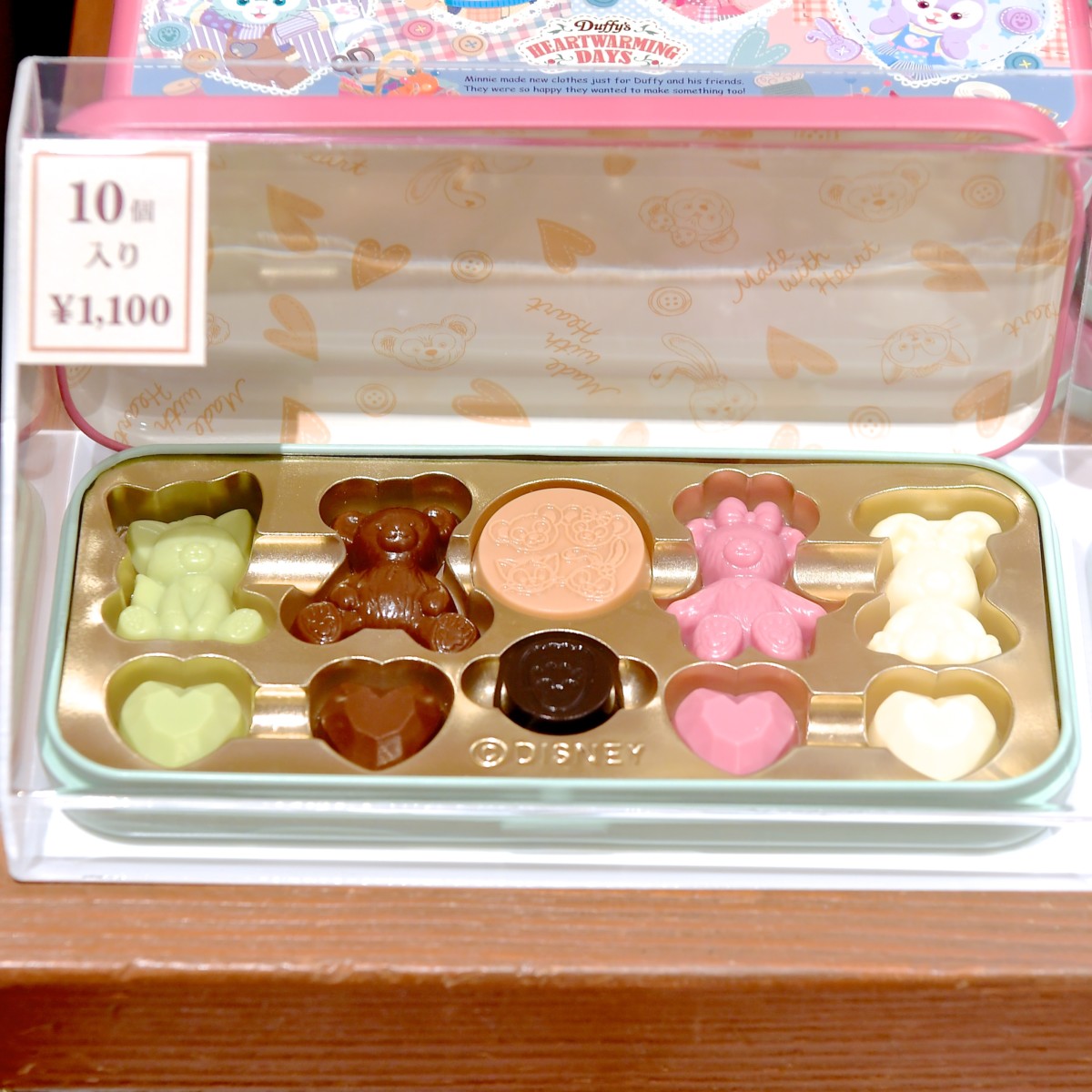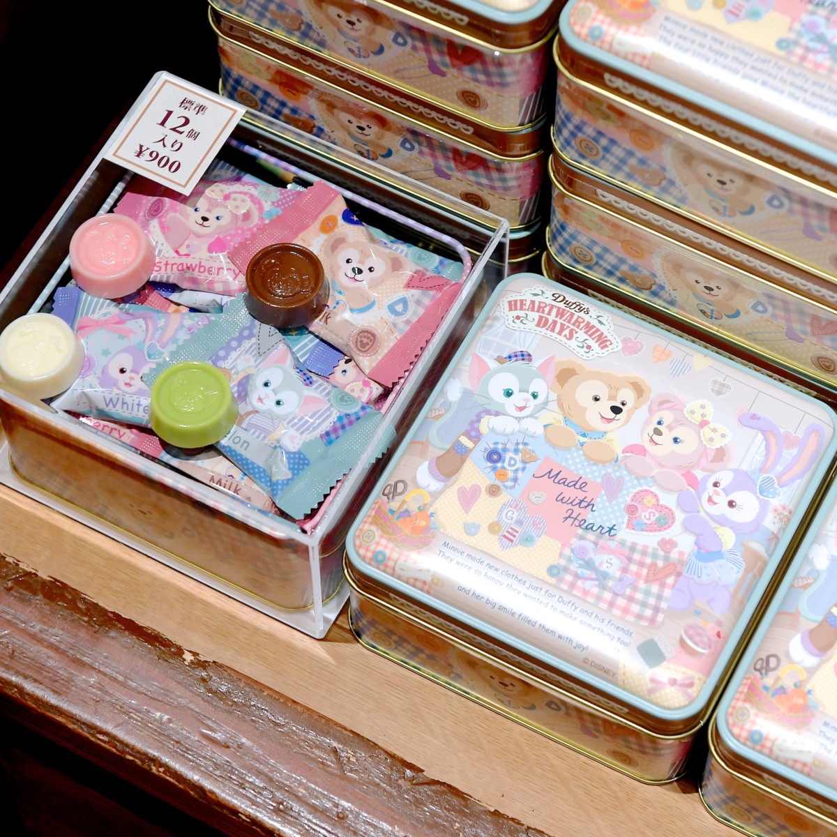 ダッフィー、シェリーメイ、ジェラトーニ、ステラ・ルーの缶入りのチョコレート。
