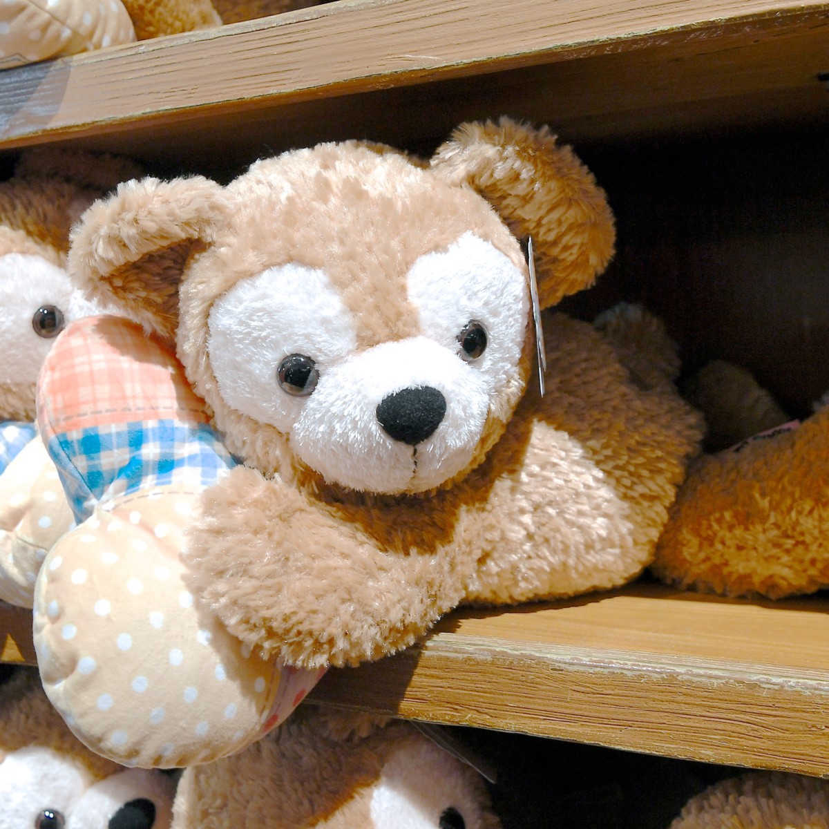 温かみのある彩りのハートを抱えたダッフィーの抱きまくら。