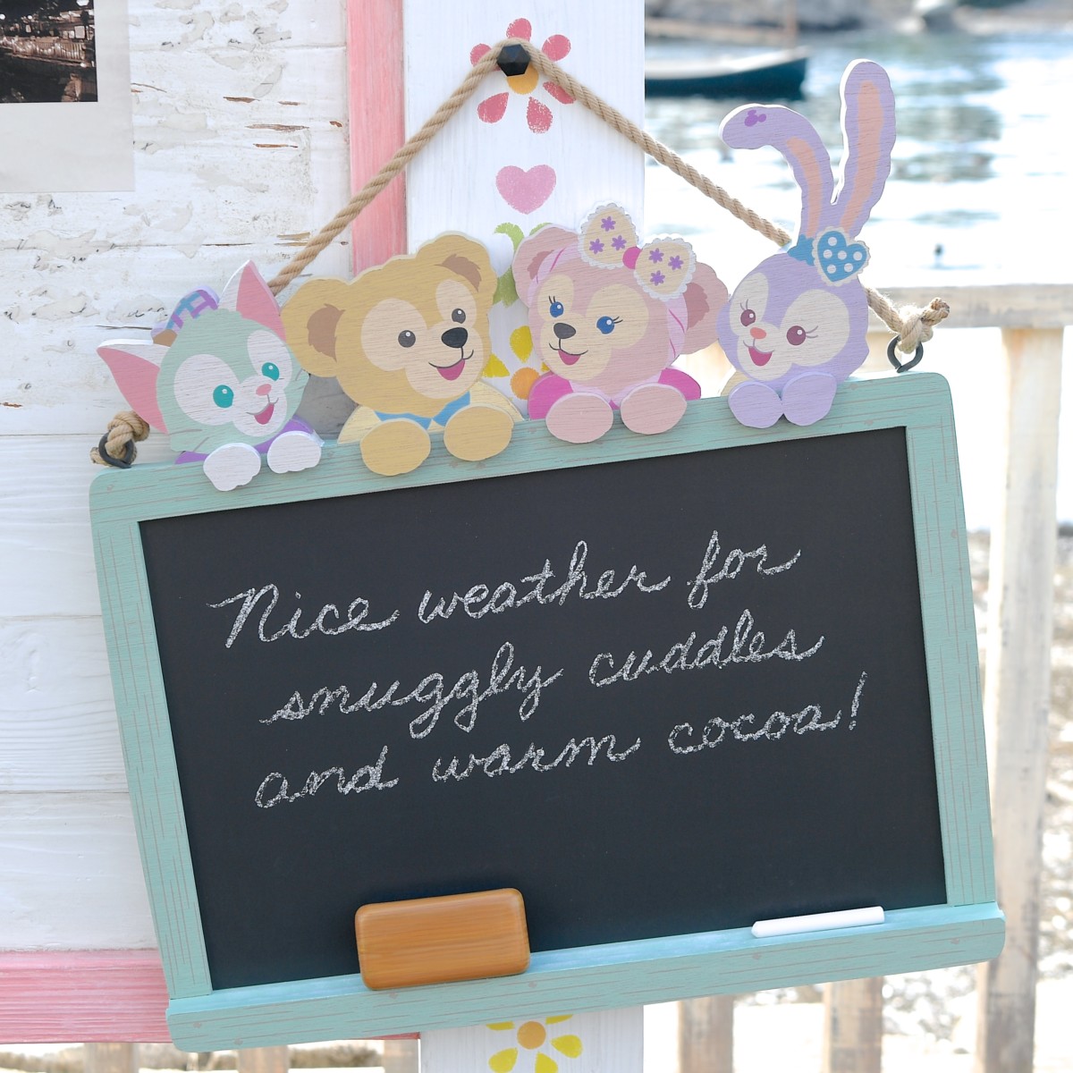お話しているようなダッフィーたちが付いたホワイトボード。