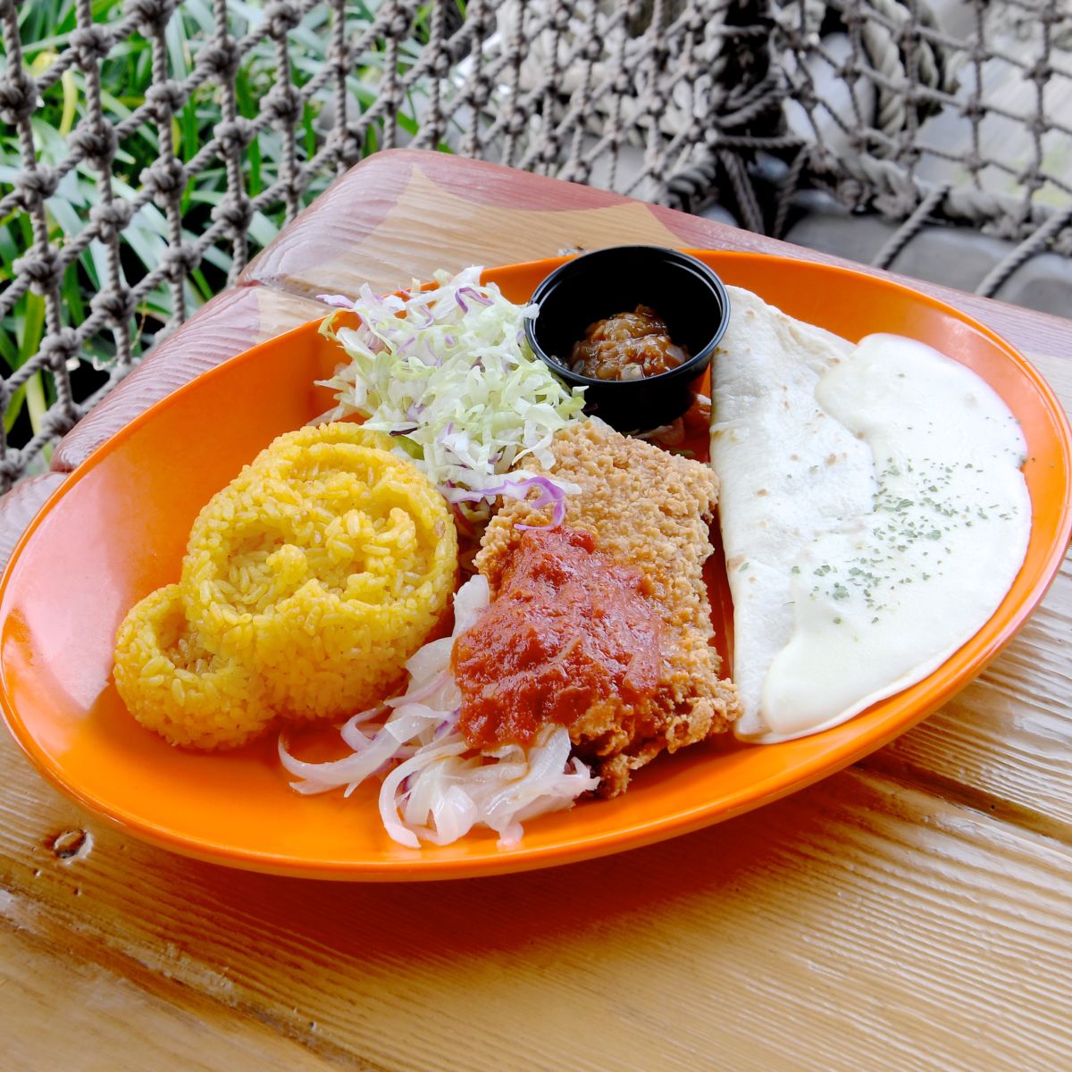 スパイシートマトソースがかけられたフライドチキンとエンチラーダもついたカラフルなプレート☆