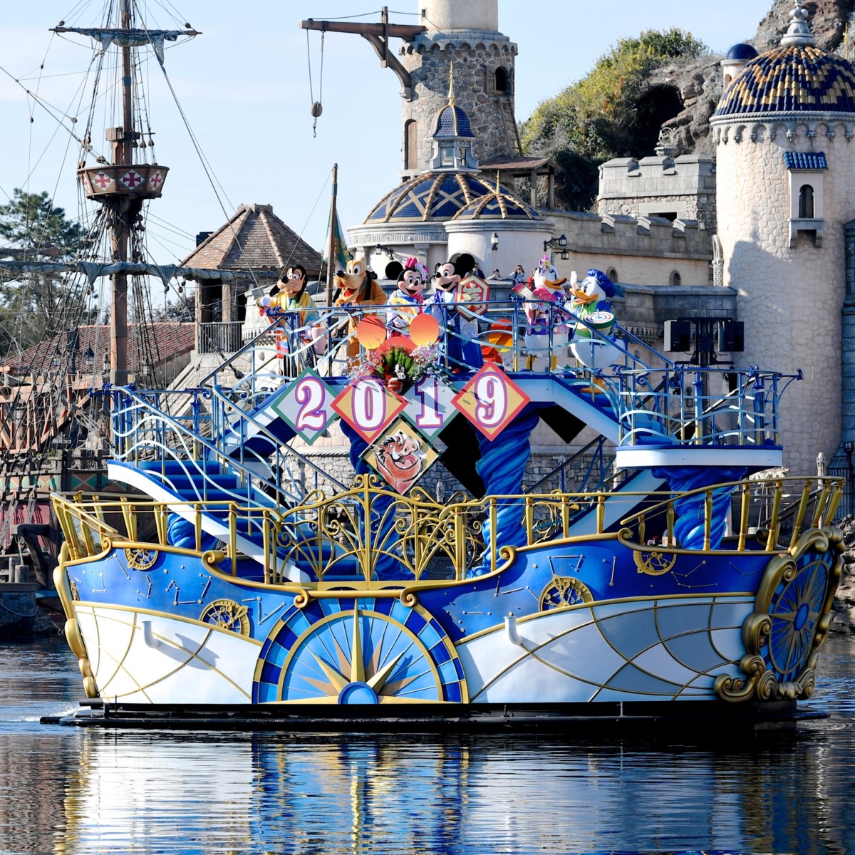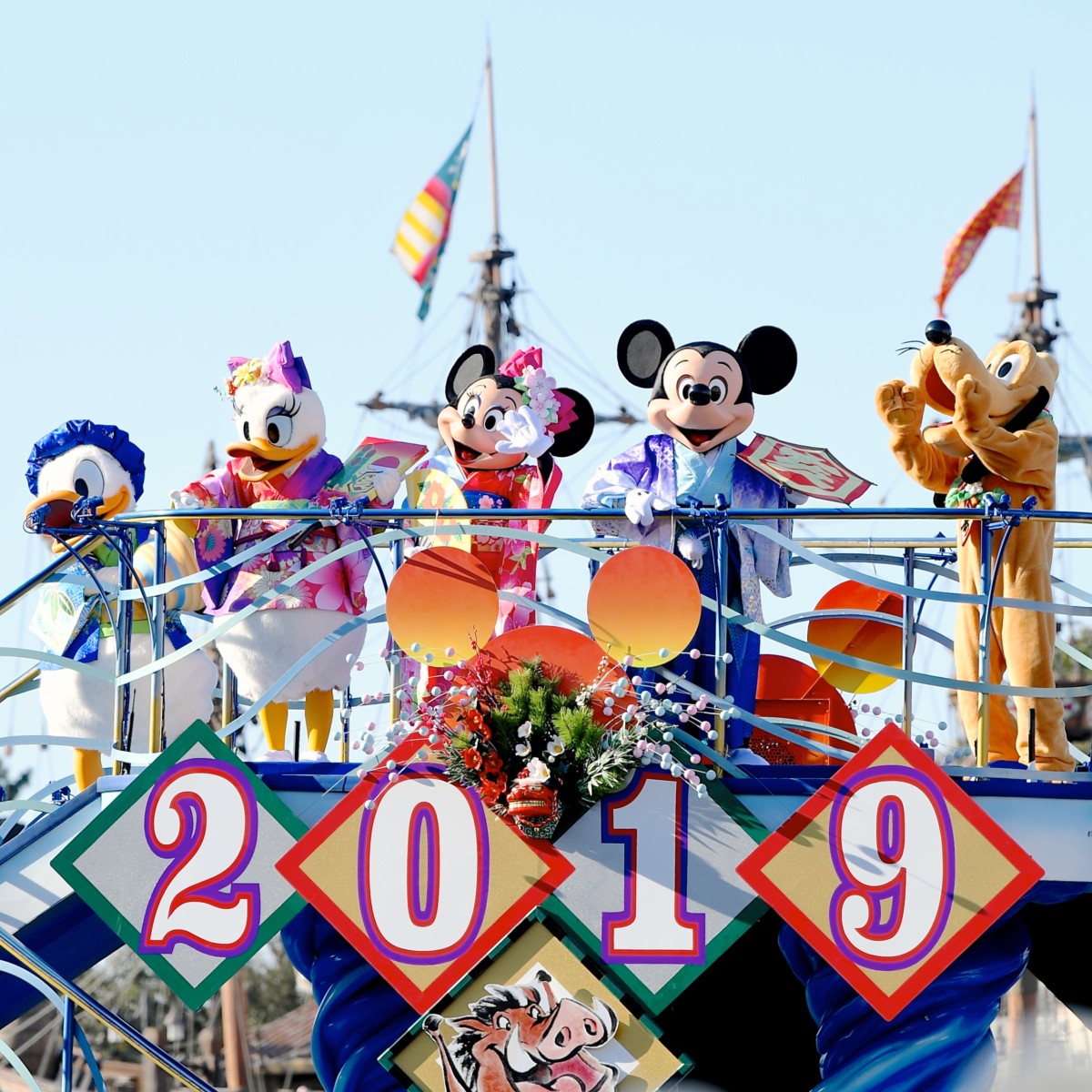 ミッキーたちが、2019年の装飾が施された船に乗って、凧や独楽(コマ)といったお正月ならではの遊び道具を手に持ち、新年のご挨拶に登場!