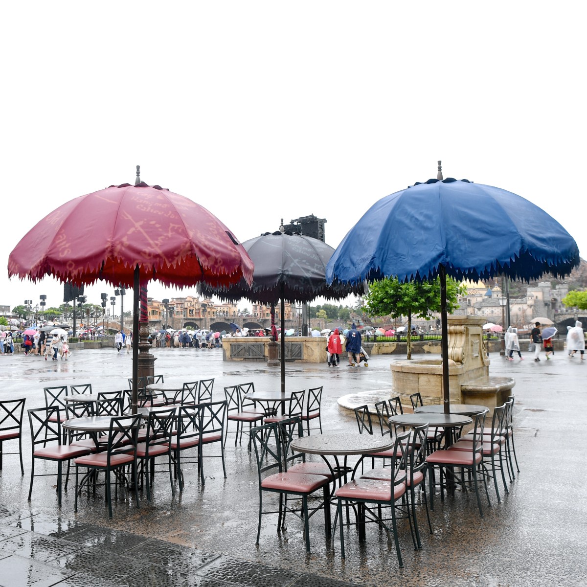 マンマ・ビスコッティーズ・ベーカリー前のパラソルも赤、青、黒に変化☆