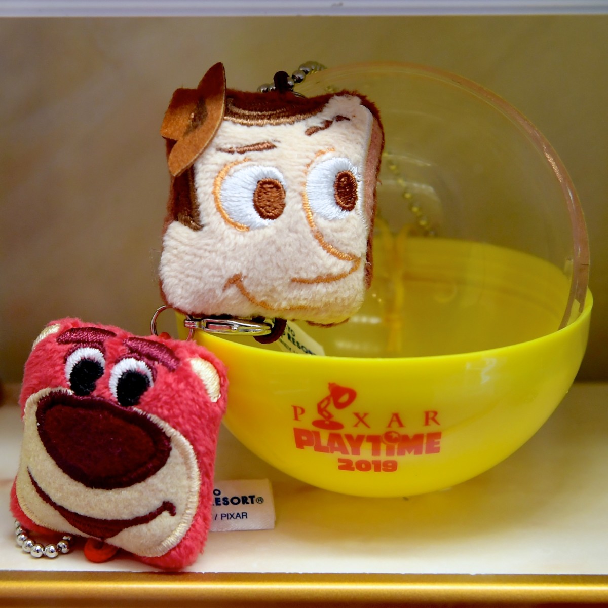 PIXAR PlayTimeのロゴ入りのカプセルに入ったかわいいPIXARキャラのペアマスコット☆