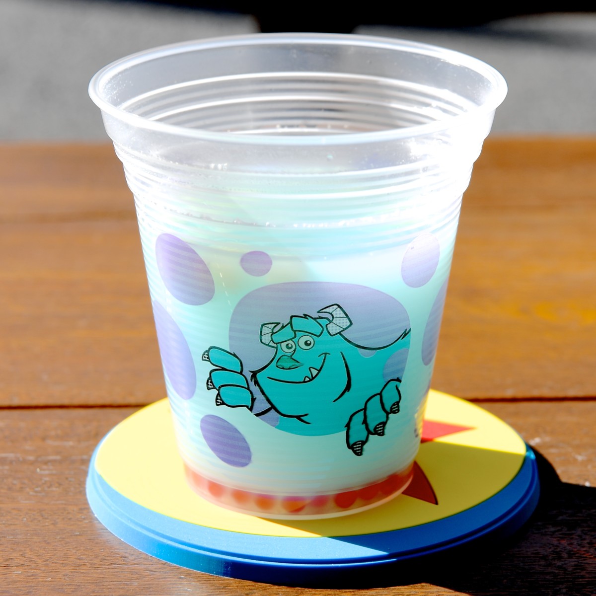 ピクサーボールデザインのスーベニアコースターがつけられる『モンスターズ・インク』モチーフのスペシャルドリンク。