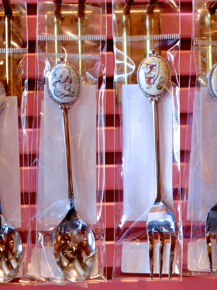 赤ちゃんダンボがデザインされたスプーンとティモシーとピーナッツがデザインされたフォーク。