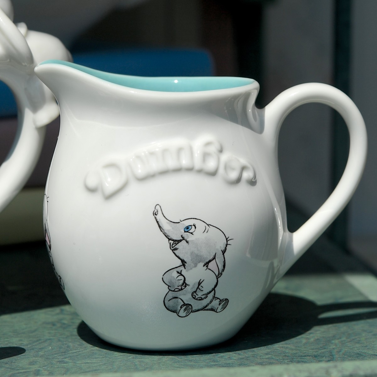 おすわりした赤ちゃんダンボがデザインされたミルクピッチャー。