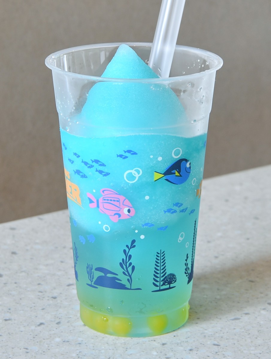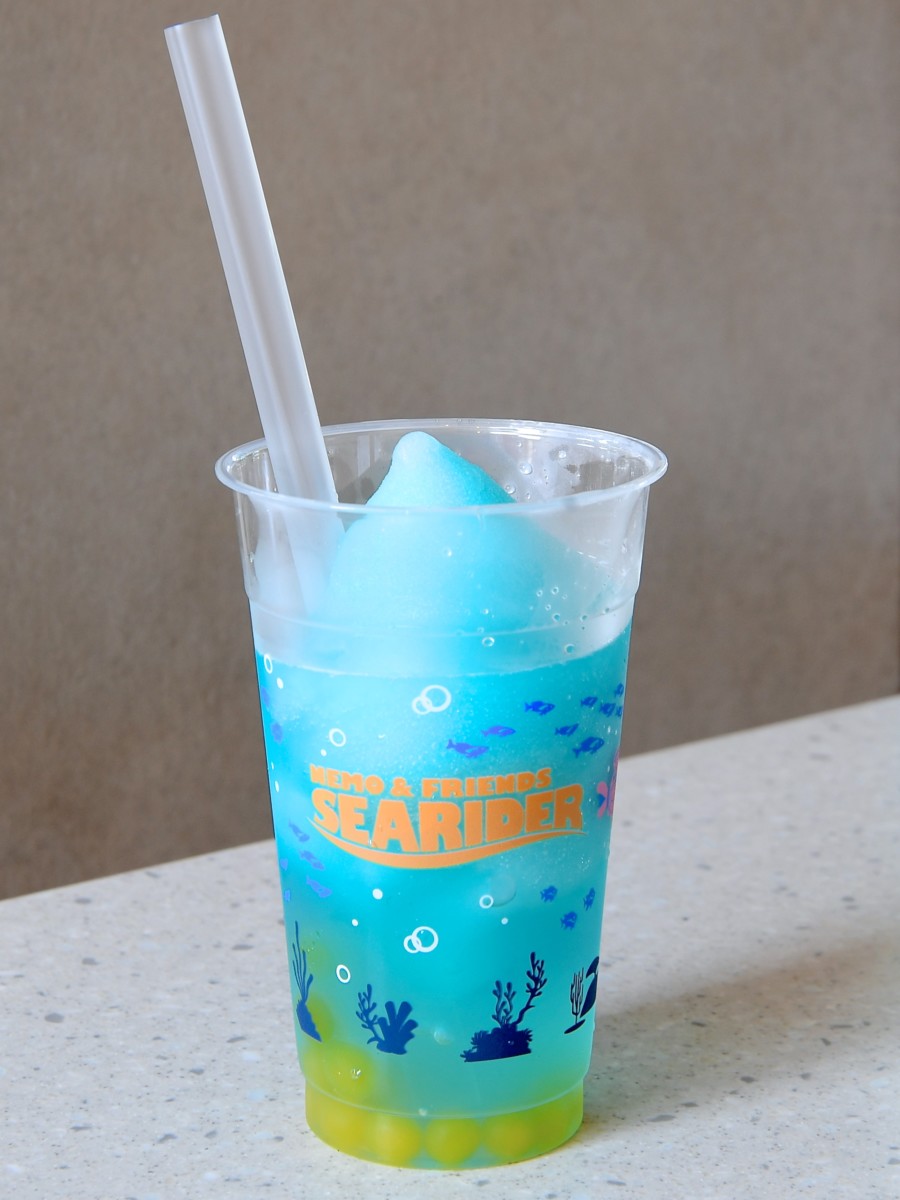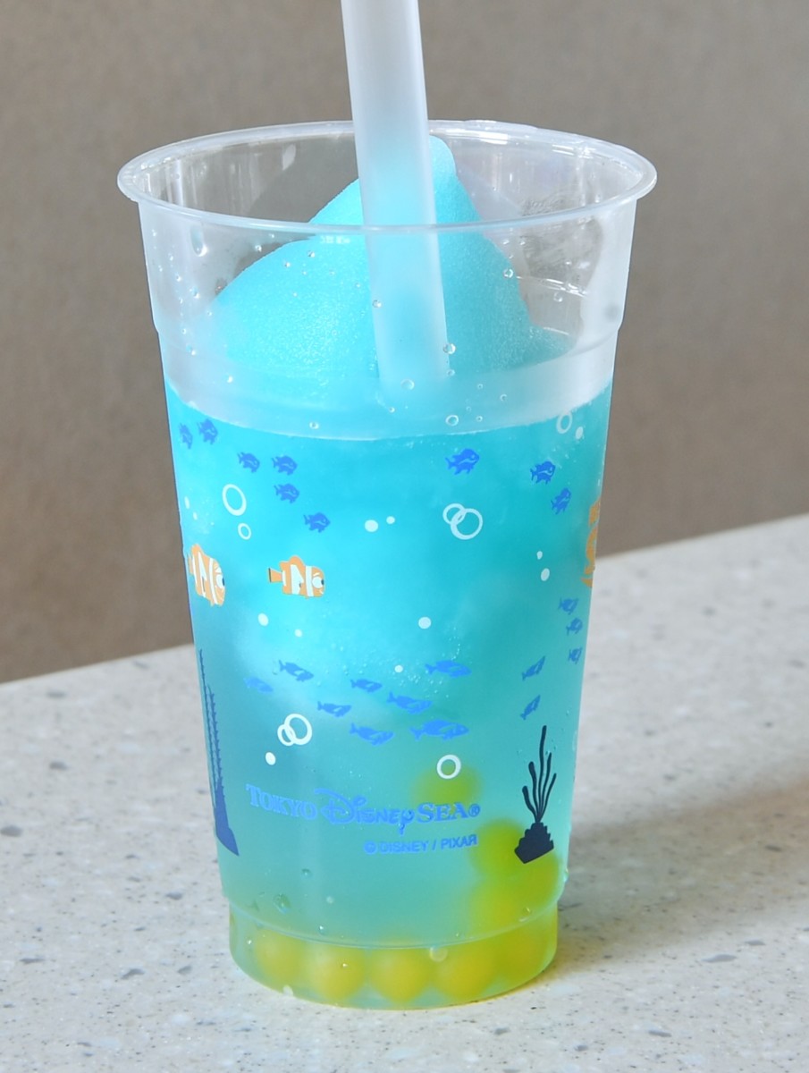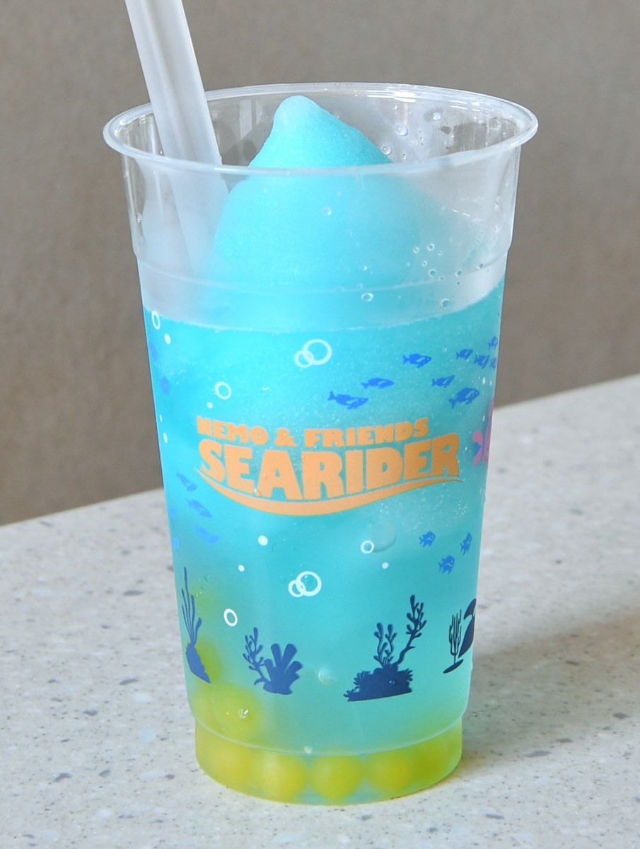 ドリンクカップに「ニモ&フレンズ・シーライダー」のロゴやニモたちがデザインされています。