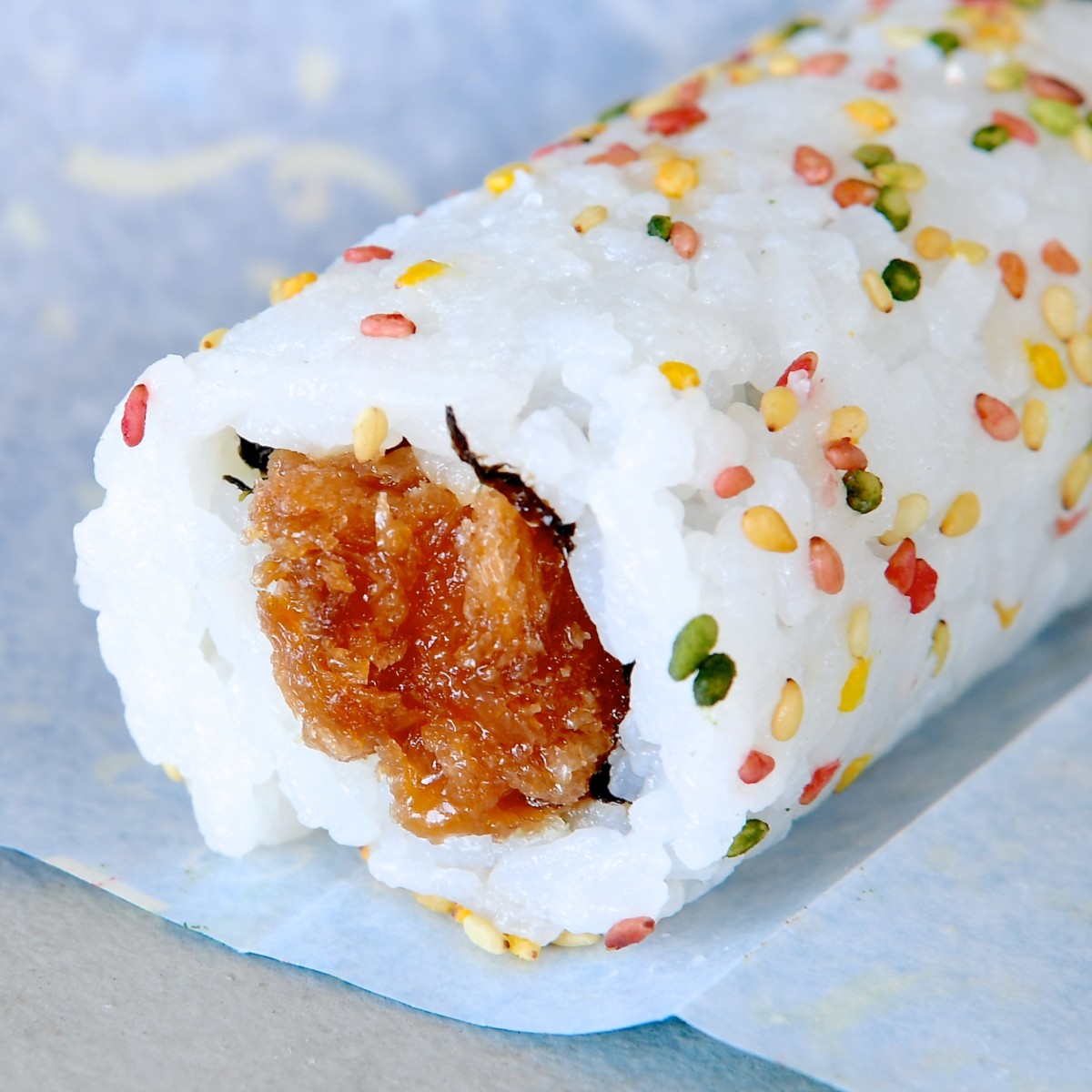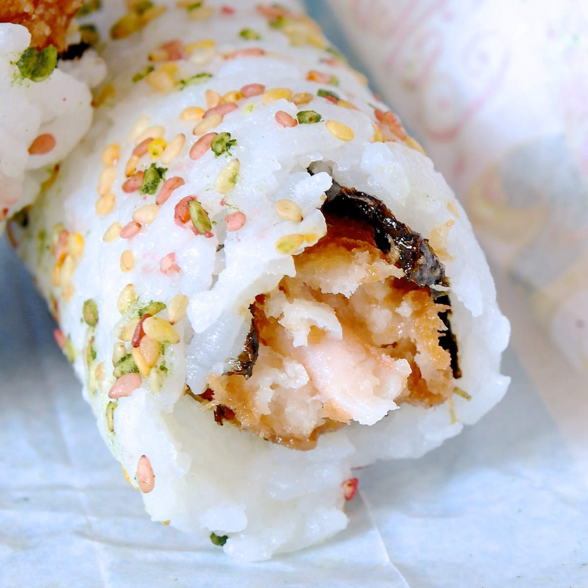 海苔で巻いたエビ入りのチキンカツをライスで包んだ新食べ歩きメニュー「寿司ロール(シュリンプ&チキンカツ)」