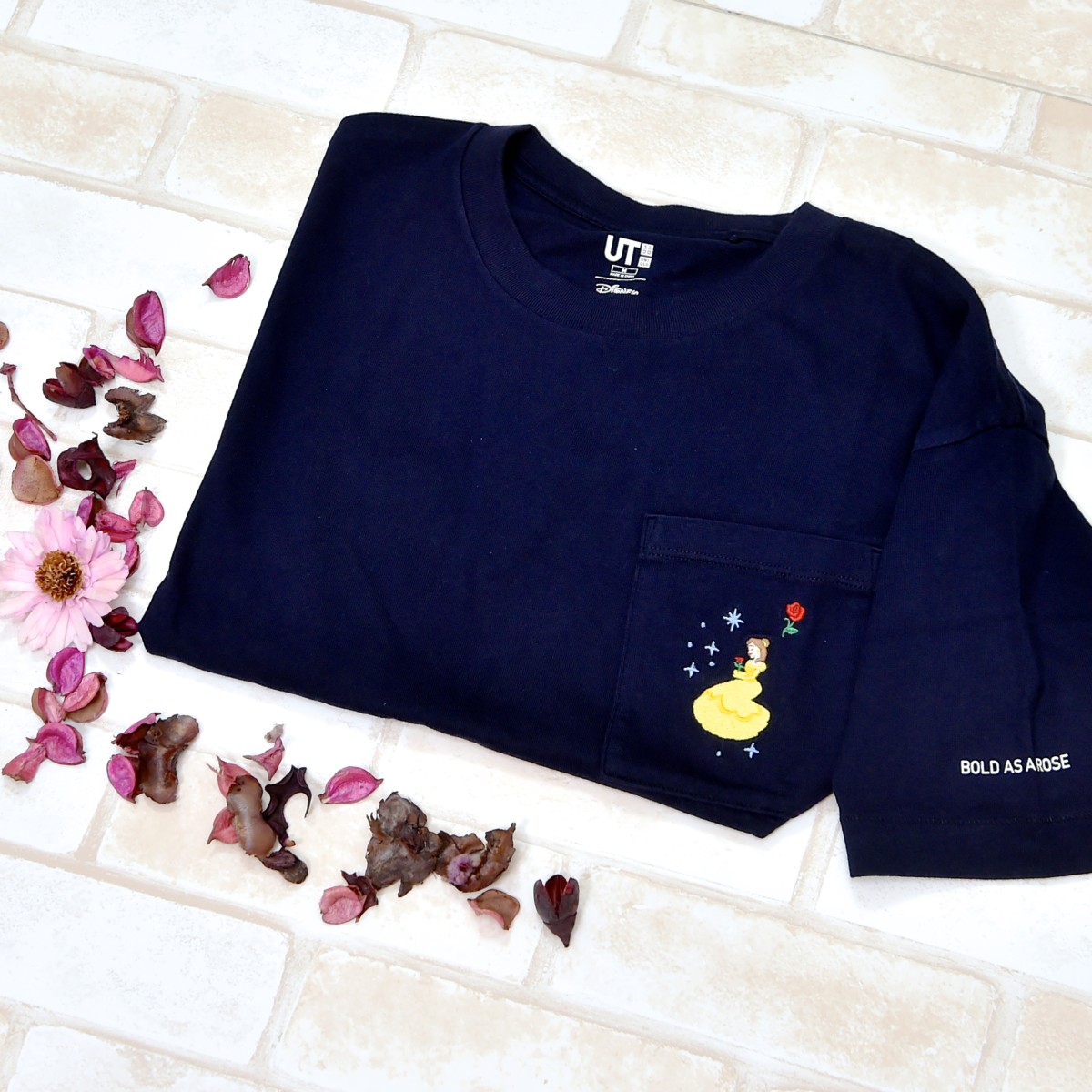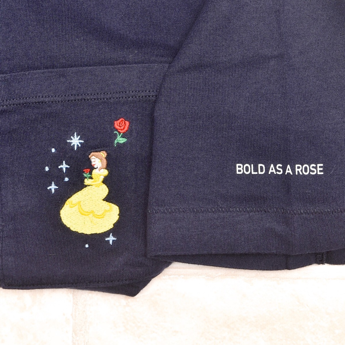 『美女と野獣』のディズニープリンセス「ベル」が刺繍された紺色Tシャツ。