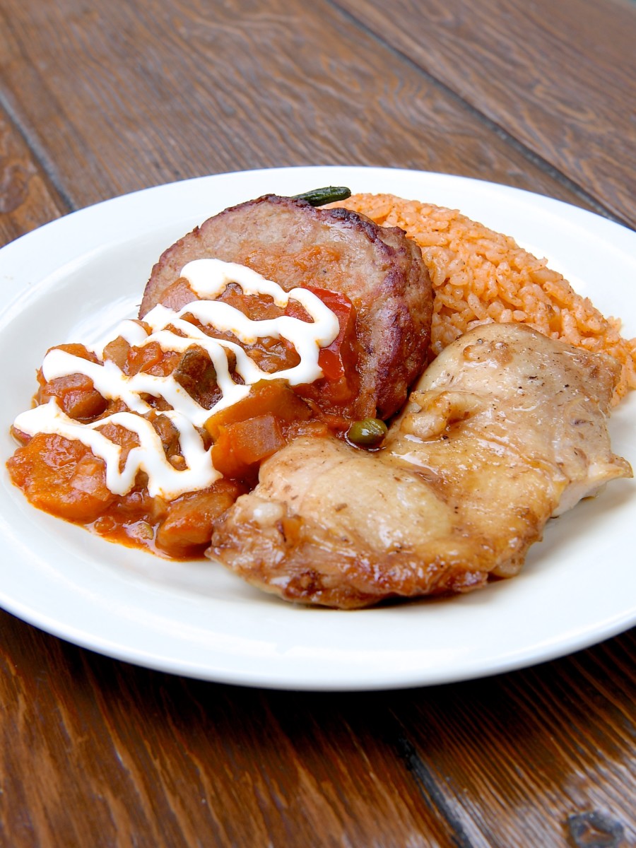 ハンバーグ ベジタブルソース、スパイシーチキン、メキシカンライス添え
