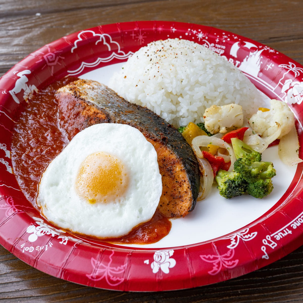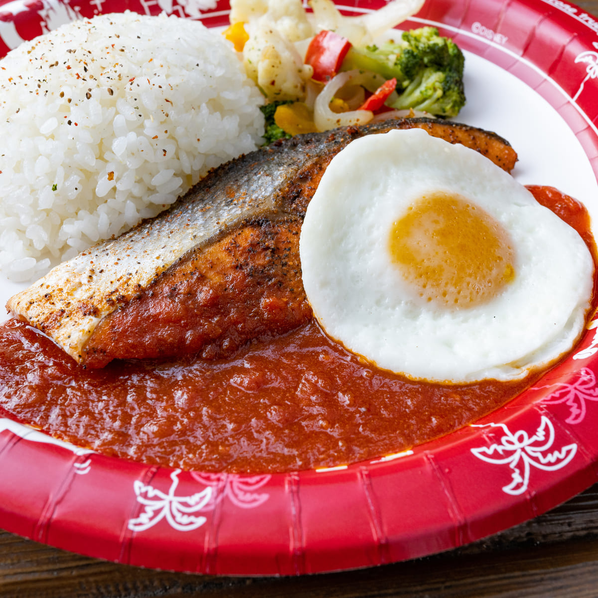 スパイシーサーモンのオーブン焼き、エッグ、ライス添え