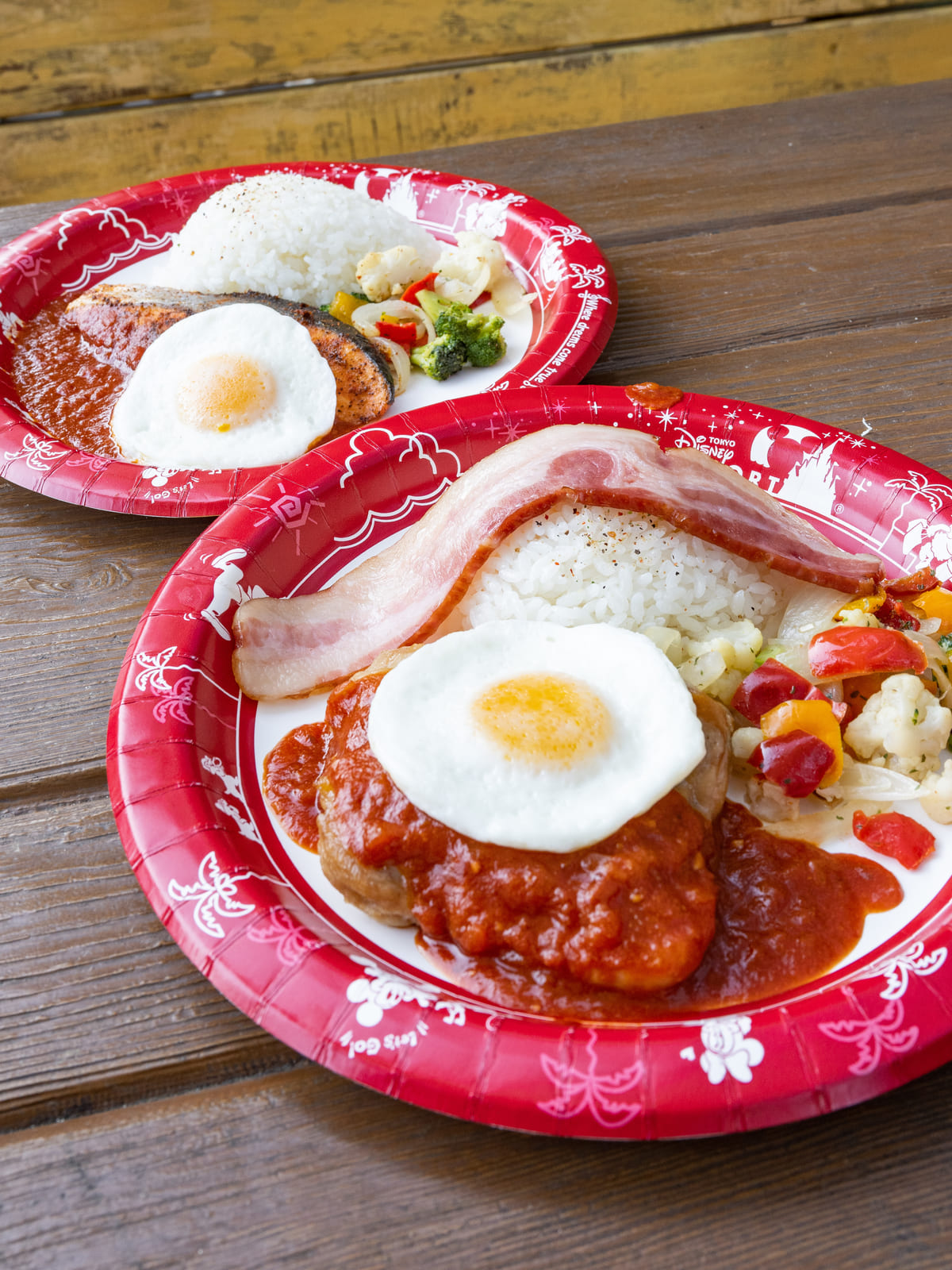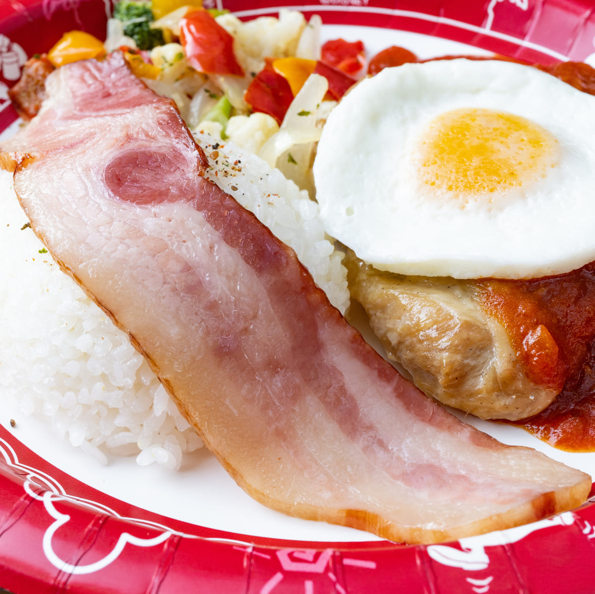 チキンのオーブン焼き、ベーコン、エッグ、ライス添え