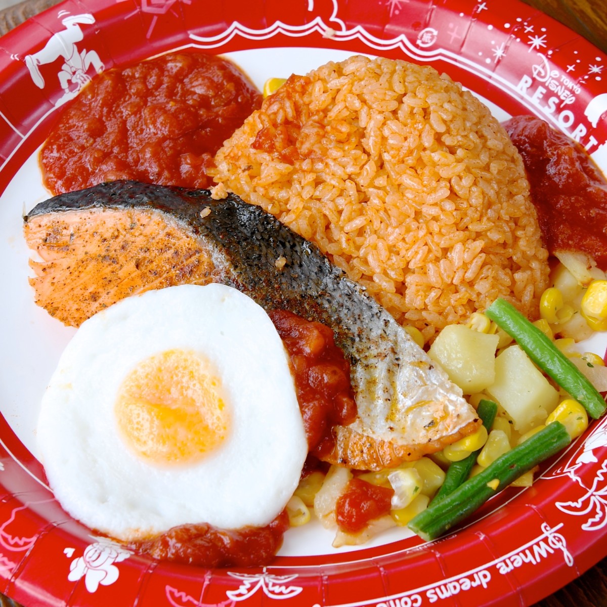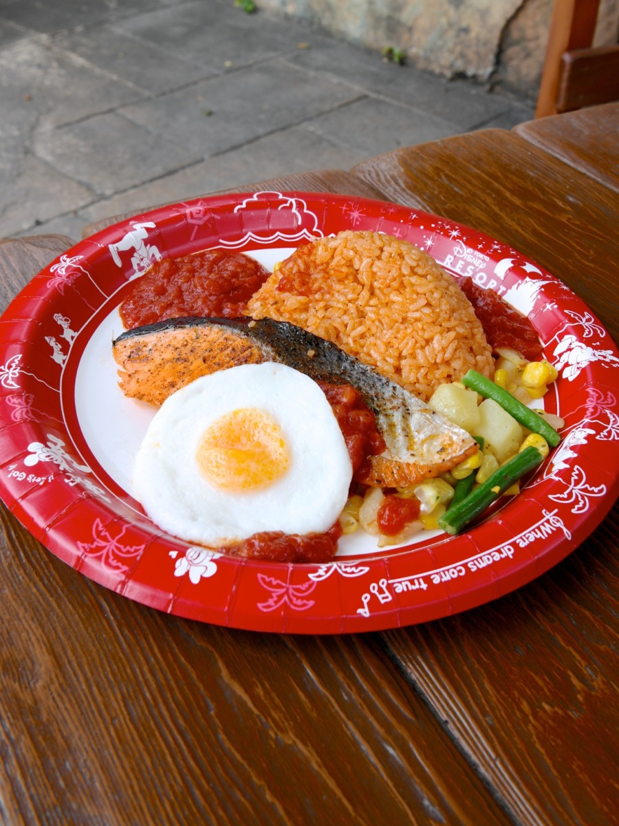 スパイシーサーモンのオーブン焼き、エッグとメキシカンライス添え