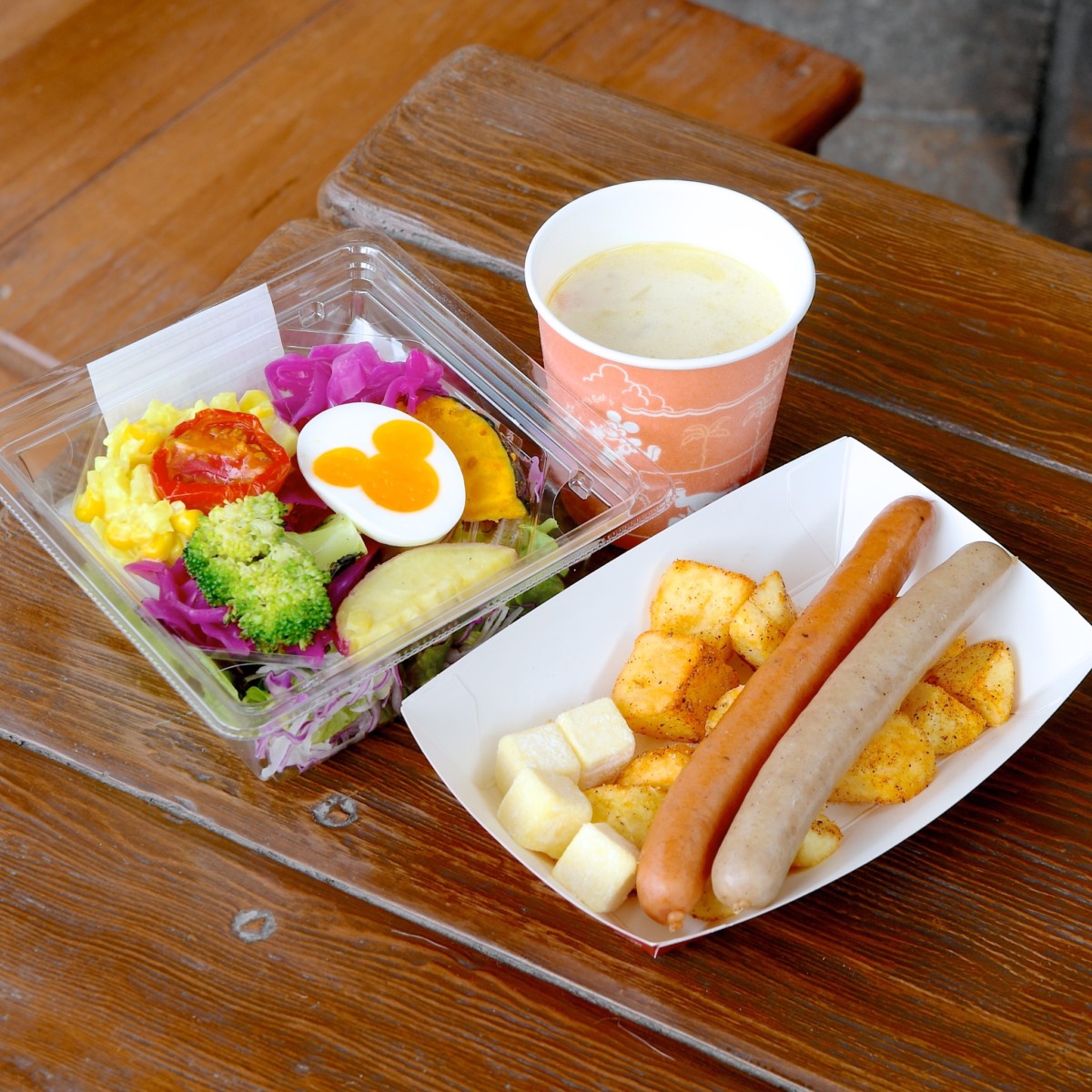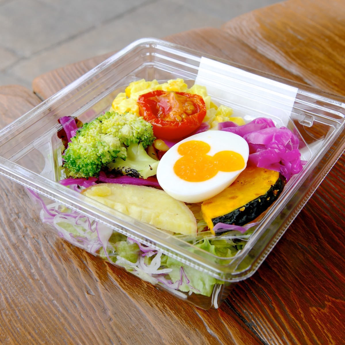 ミッキーシェイプのゆでたまごをメインに、色とりどりの野菜がたっぷりはいったサラダ。